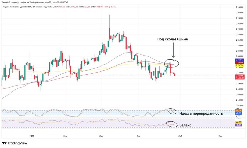 Наша постоянная рубрика: что ждать на текущей неделе, какая техническая картина нас ждёт, ну и какие важные новости вышли за выходные и как они могут повлиять на движение российского рынка, а также на чьей стороне находятся умные деньги. Техническая картина Локально: локальная нисходящая тенденция завершена, закрепились. Фигура «Двойное дно» является разворотной, есть вариант сходить выше (временно). Есть попытки формирования восходящего (локального), в ближайшие дни будет понятно, хватит ли сил. Среднесрочно: по-прежнему отсутствует среднесрочный тренд, ждем формирования наклонной. А пока ориентир на локальный. Техническая картина. Индикаторы: ➥ Stochastic. Вышли из перекупленности, считается локальной коррекцией. В понедельник — вторник будем в перекупленности. ➥ RSI. Снова в середине диапазона, есть большая вероятность боковика. ➥ Скользящие средние. Цена под ЕМА200, 100 и под ЕМА50, пробить не смогли. Есть вероятность, что модель «Золотой крест» будет сломана. Умные деньги: после экспирации юрлица по-прежнему находятся на стороне медведей, дисбаланс не меняется, перевес по-прежнему на стороне медведей. Умные деньги ставят на продолжение снижения. Геополитика, новости, которые вышли на выходных: — ВМС США ЗАХВАТИЛИ ИРАНСКИЙ ТАНКЕР, ПЕРЕВОЗИВШИЙ НЕФТЬ НА СУММУ $380 МЛН. — ГЛАВА МИД ИРАНА АББАС АРАКЧИ ПРИБЫЛ В САНКТ-ПЕТЕРБУРГ ДЛЯ ВСТРЕЧИ С ПУТИНЫМ. — США продолжают попытки добиться украинского урегулирования — Трамп, отметив, что общается с Владимиром Путиным. Вывод Негатив со стороны ЦБ, увеличили диапазон ожидания ставки на 2026 г. и 2027 г. ЦБ намекнули, что могут взять паузу для снижения ставки. У рынка акций и так отсутствуют драйвера для роста, еще и ЦБ добавил «масла в огонь». Среднесрочные перспективы отсутствуют, как и объемы. Рассматриваем рынок акций исключительно спекулятивно. Важно: в приоритете облигации, рынок акций будет новостным (еще и среднесрочный тренд отсутствует). Доходность ОФЗ сравнялась с фондами денежного рынка. Все завязано на конфликте на Ближнем Востоке. Полноценного роста российского рынка не будет, пока конфликт будет продолжаться (от этого зависит переговорный процесс и информация). Данный материал носит информационный характер и [не является индивидуальной инвестиционной рекомендацией](https://mondiara.com/communities?open=community-1163) или предложением о покупке или продаже указанной ценной бумаги. Источник: Trendoman "Торговые сигналы"