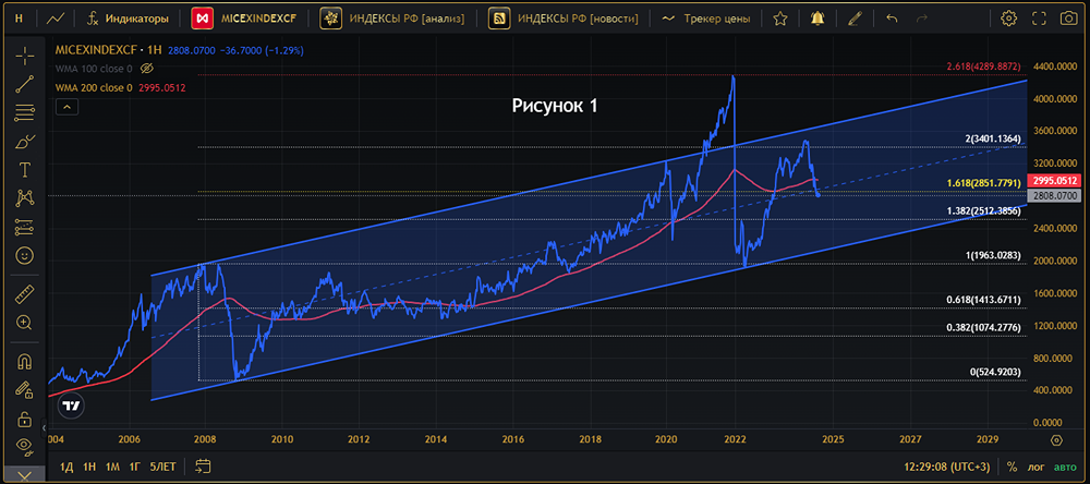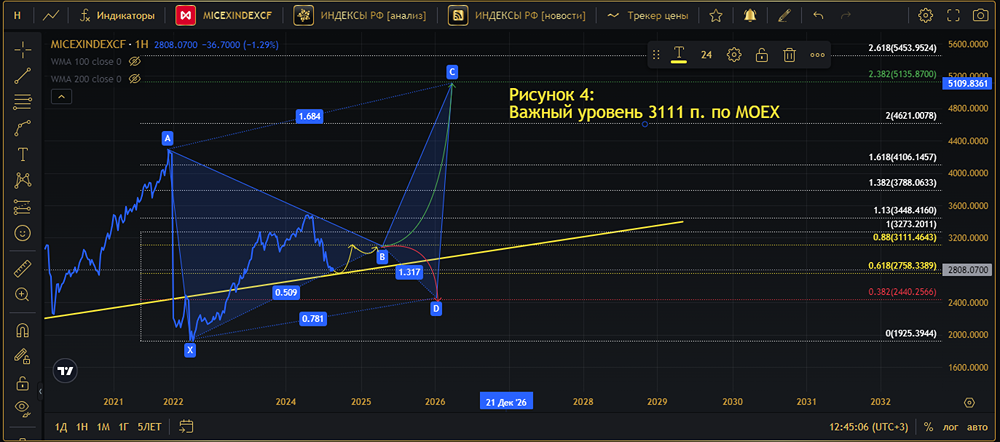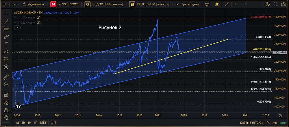 Недельный линейный график с техническими расчётами вероятностей изменения цены по основному Индексу РФ.