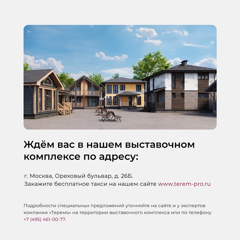 Выгодные предложения 23.04 - 30.04 Весна — время обновлений и новых начинаний. Сейчас отличный момент, чтобы сделать шаг к собственному дому. Заключите договор в период акций, заезжайте уже этим летом! Подробности специальных предложений уточняйте у экспертов компании «Теремъ»: [на сайте](https://www.terem-pro.ru/promotion/), на территории выставочного комплекса или по телефону +7 (495) 461-00-77. Ждём вас по адресу: г. Москва, Ореховый бульвар, д. 26Б 🕙 будни 10:00–20:00, выходные 10:00–19:00 → [Закажите бесплатное такси](https://m.terem-pro.ru/forms/form_taxi/) → [Спланируйте удобный маршрут](https://yandex.ru/maps/-/CDR1qYji) https://www.terem-pro.ru