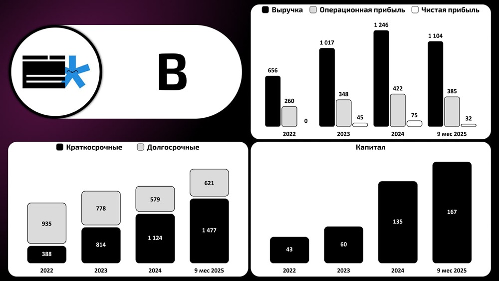 💰 ООО ПКО «Вернем» Финансовые результаты за 9 месяцев 2025 года К предыдущему периоду: 🟢 Выручка выросла на 33,9% 🔴 Чистая прибыль снизилась на 36,6% 🟢 Капитал увеличился на 23,7% 🟢 EBITDA составила 390 млн (+29,1%) 🔹 Денежный поток от операционной деятельности: -359 млн (+31 млн) Рентабельность по EBITDA: 35,3% Долговая нагрузка: Облигационный долг: 150 млн Чистый долг: 1 961 млн (+26,4%) Финансовые коэффициенты: EBITDA LTM: 517 млн ЧД/EBITDA LTM: 3,79 | 3,62 ЧД/Капитал: 11,7 | 11,5 🔴 Коэффициенты долговой нагрузки: - Коэффициент покрытия: 1,16 - Коэффициент ликвидности: 0,39 - Обязательства/Активы: 92,6% Последние выпуски облигаций: 🔷 Вернем-БО-01 (26,50%) - Доходность: около 28,6% - Цена: 102,3% - Срок: 1,4 года (погашение 20.08.27) - ISIN: RU000A10ED62 🔹 Вернем-БО-02 (25,50%) - Дата размещения: 10 апреля Рейтинговая оценка: 11.12.25 НРА присвоило кредитный рейтинг ООО ПКО «Вернём» на уровне «B|ru|» с прогнозом «стабильный». Не является индивидуальной инвестиционной рекомендацией Источник: Финансовые показатели | Отчет