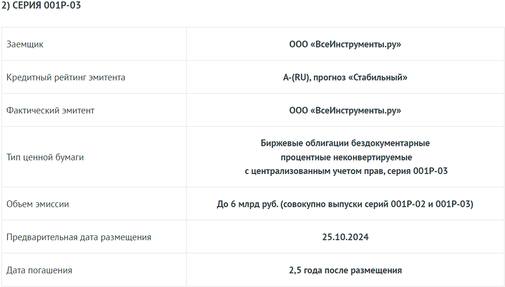 АКРА присвоило ожидаемый кредитный рейтинг еA-(RU) облигациям ООО «Всеинструменты.ру» серий 001Р-02 и 001Р-03 Источник: www.acra-ratings.ru