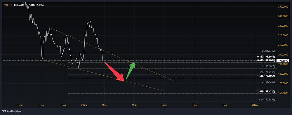 ПАО ИВА Среднесрочный технический взгляд по акциям ТФ: 1Д [день] Для расчёта будущей стоимости активов применяется алгоритмический подход, который учитывает поведение цены, основываясь на числовой последовательности Фибоначчи. Еще больше расчётов можно найти по ссылке нашего канала в социальной сети M O N D I A R A: https://i.mondiara.com/i/c/mondiara_trading Данный материал носит информационный характер и не является индивидуальной инвестиционной рекомендацией или предложением о покупке или продаже указанной ценной бумаги.