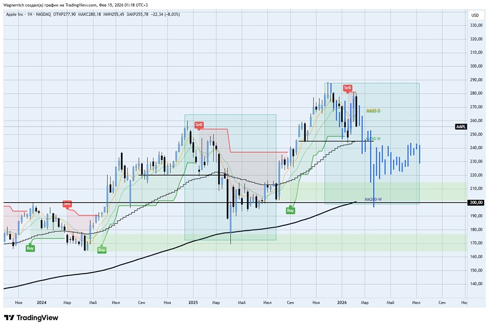 Акции давно вышли за рамки статуса ТНК и стали частью массовой религии сверхпотребления. Современный капитализм держится именно на таких образах, когда бренд перестаёт быть товаром и превращается в объект веры. Антонио Грамши называл это культурной гегемонией. Когда видишь километровые очереди за новой версией устройства, отличающейся от старой в деталях, становится понятно, насколько мир безнадежен и насколько глубоко бренд встроен в психику толпы. Бумагу десятилетиями покупали по умолчанию, как «безопасный актив». Но на фоне этого происходят вещи, на которые стоит обратить внимание: Уоррен Баффет, крупнейший акционер Apple, с 2024 года системно сокращает долю акций в портфеле, частично перераспределяя капитал в кэш и другие истории. По технике, за последнюю неделю акции потеряли около 8%, одной свечой на недельном графике поглотив весь рост предыдущей — получили полноценный разворотный бар под зоной исторических максимумов 280–290. На недельном тф тренд формально остаётся восходящим, цена выше ema50w, но текущая ситуация подозрительно рифмуется с фракталом конца 2024, тогда вершину тоже сопровождал медвежий пин‑бар на неделе, коррекция к ema50w, сигнал селл на недельном тф, распил дневных ema и, в итоге, пробой локального уровня и ema50w с переходом в нисходящий тренд. На дневке за 39 дней ТТ дал три разнонаправленных сигнала бай/селл — типичное поведение индикатора в фазе консолидации, когда тренд выдыхается и рынок переходит в боковик. Сверху выступает сопротивление 280–290, снизу важные уровни 240 и крупная поддержка в районе 200. Apple и Nvidia сейчас не просто большие компании, а два системных столпа текущего цикла: потребительский мегабренд и главный бенефициар ИИ‑нарратива. Пока ema50w по Apple и ключевая поддержка по [Nvidia](https://t.me/wagner1813/599) держат, рынок ещё может отыграть это как очередную реаккумуляцию. Но если оба системных актива синхронно пробьют свои опорные уровни и подтвердят разворот, это будет не просто локальная коррекция по отдельным бумажкам, а начало формирования медвежьего рынка. В течение ближайшей недели я разберу остальные акции из MAGS (что‑то будет публично), чтобы у вас сложилась целостная картина, как себя чувствуют ключевые бенефициары ИИ‑ралли, где рынок уже перешёл в фазу распределения, а где ещё сохраняется запас прочности. Не является индивидуальной инвестиционной рекомендацией [mondiara.com](https://mondiara.com) 👆 Больше новостей и анализа Скачать приложение в [App Store](https://apps.apple.com/ru/app/m-o-n-d-i-a-r-a/id6475953453) Скачать приложение в [Google Play](https://play.google.com/store/apps/details?id=com.mondiara.app) Пост взят с международного сервиса для инвесторов и трейдеров [M O N D I A R A](https://i.mondiara.com/) Источник: Wagner