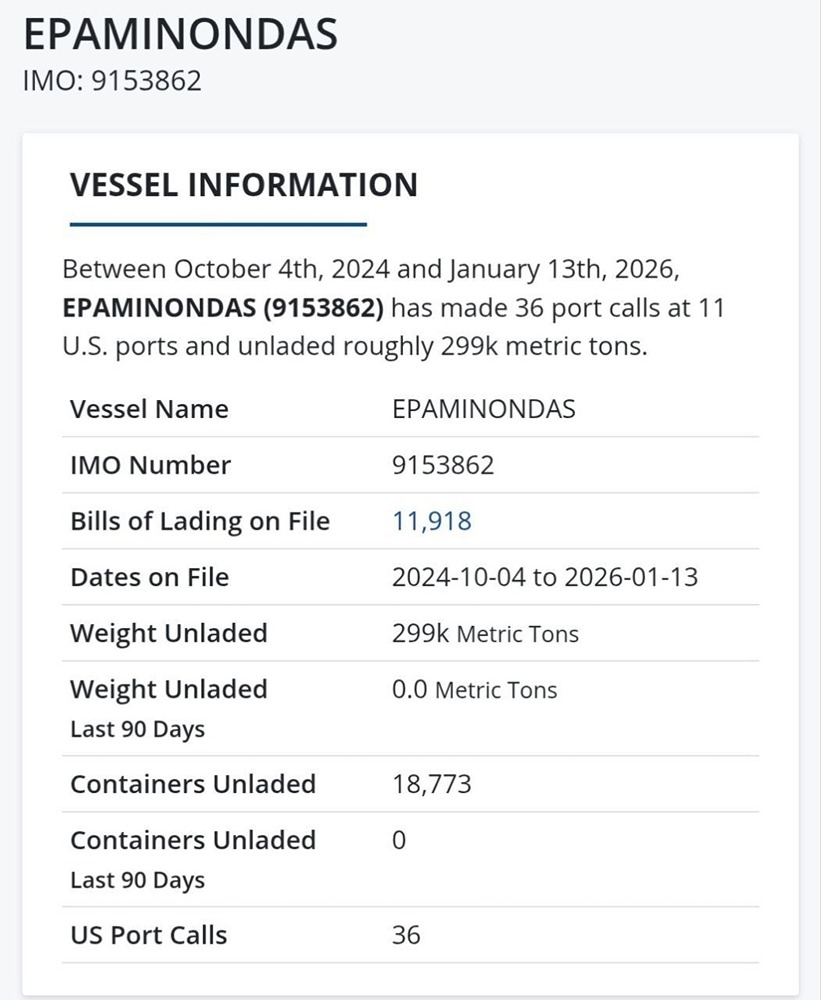 Согласно последним данным, судно EPAMINONDAS, задержанное КСИР, является контейнеровозом, следовавшим в порт Мундра (Индия). В настоящее время судно ходит под флагом Либерии. Последний раз его местоположение фиксировалось два дня назад — вблизи острова Ларк, к востоку от Ормузского пролива. По зарегистрированным данным, в период с октября 2024 года по январь 2026 года это судно 36 раз заходило в 11 различных портов США и выгрузило около 299 тысяч тонн грузов.
