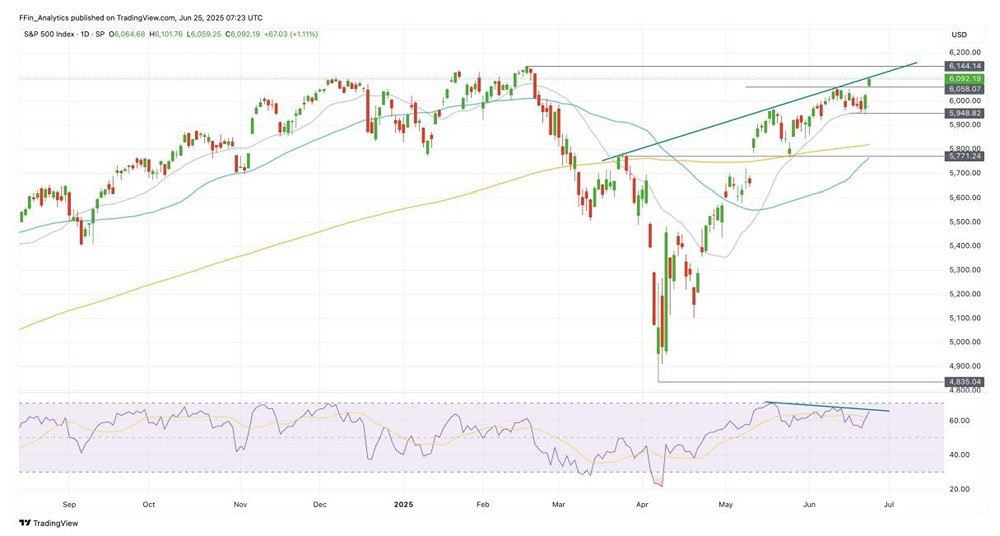 Мнение: Freedom Finance Global Инвесторы из США активизировались и начали действовать более рискованно. Индекс S&P 500 преодолел отметку в 6060 пунктов, продолжив уверенный рост после отскока от 20-дневной скользящей средней. Движение приостановилось вблизи наклонной линии тренда, которая соединяет вершины, достигнутые 25 марта и 19 мая. Эта линия может стать препятствием, как и область 6100–6145 пунктов. Достижение исторического максимума представляется сложной задачей, поскольку индикатор RSI всё ещё показывает «медвежью» дивергенцию. Источник: finam.ru Автор: Калымбеков Амирлан Не является индивидуальной инвестиционной рекомендацией В этом сообщении представлено мнение экспертов инвестиционной компании или банка. Оно предоставляется исключительно для ознакомления и не является рекомендацией для покупки или продажи ценных бумаг, а также для принятия каких-либо коммерческих или других решений. Mondiara.com не несёт ответственности за содержание этого сообщения и последствия его использования.
