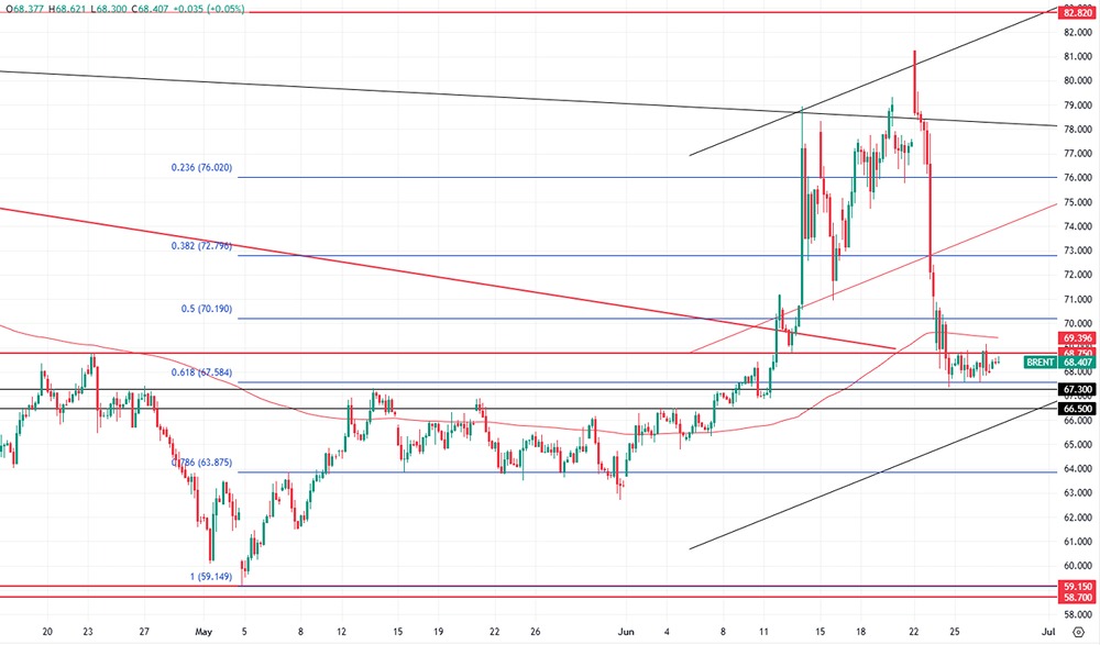 Мнение: Финам Цены на нефть Brent: почему цена колеблется в диапазоне 68–69 долларов и что ждать дальше В четверг на торгах стоимость нефти марки Brent увеличилась на 0,3%. В какой-то момент цена вновь опустилась ниже отметки в 68,75 долларов за баррель, но чуда не произошло, и закрытие сессии состоялось на уровне около 68 долларов за баррель. В настоящее время мы наблюдаем небольшой рост цены. Если посмотреть на ситуацию более широко, то с среды цена колеблется в диапазоне 68–69 долларов за баррель. Таким образом, текущая неделя выдалась одной из самых «красных». Если сегодня не произойдёт неожиданного разворота вверх, то падение составит не менее 13,1%, что сопоставимо с началом июня, когда цена опустилась на 13,2%. Сообщается, что Израиль разрешил возобновить добычу на двух морских проектах, которые были приостановлены 14 июня из-за начала боевых действий. Речь идёт о месторождении Левиафан, которое разрабатывает компания Chevron, а также о плавучей установке компании Energean Power. Ранее сообщалось, что из-за ударов Ирана был повреждён нефтеперерабатывающий завод в Хайфе, что привело к тому, что Израиль остался без действующих НПЗ и превратился в чистого импортёра нефтепродуктов. Между тем, после начала восстановления движения в Ормузском проливе сообщается, что ставки фрахта на нефтяные танкеры снова начали снижаться. По информации Bloomberg, ставки фрахта упали на 17%. Drewry, в свою очередь, обновил данные о ситуации с ценой фрахта 40-футового контейнера за неделю, закончившуюся 26 июня. Индекс контейнерных перевозок снизился на 9%. Стоимость фрахта контейнера составляет 2983 доллара. Однако, как мы уже говорили, конфликт на Ближнем Востоке ещё не полностью разрешён. Лидер йеменских хуситов заявил, что Красное море закрыто для израильских судов. Кроме того, были зафиксированы запуски баллистических ракет из Йемена в сторону Израиля. LSEG Oil Research сообщает, что в первом полугодии импорт нефти в Азию значительно вырос. За шесть месяцев в регион было поставлено около 27,4 миллиона баррелей, что на 2,3% (620 тысяч баррелей) больше, чем за аналогичный период прошлого года. Спрос на нефть увеличился как в Китае, так и в Индии. Ранее сообщалось, что в июне нефтедобывающие страны увеличили экспорт, несмотря на возросшие риски. По данным Kpler, за первые шесть недель июня поставки из ОАЭ и Ирака выросли на 10% по сравнению с предыдущим месяцем, а из Саудовской Аравии — на 16%. Тем временем, из-за низких цен на нефть доходы Саудовской Аравии продолжают сокращаться. По информации Bloomberg, в апреле доходы Саудовской Аравии составили около 16,5 миллиарда долларов, что на 21% меньше, чем за аналогичный период прошлого года. Ситуация остаётся сложной для королевства. Глава Организации стран-экспортёров нефти (OPEC) заявил на экономическом форуме, что, по его мнению, спрос на нефть будет расти до 2050 года, поскольку население планеты увеличивается, а мировая экономика растёт. Он также подчеркнул, что отрасль недоинвестирована, что является общей проблемой для многих стран-производителей. С технической точки зрения ситуация с ценой на нефть остаётся стабильной. На краткосрочном четырёхчасовом графике видно, что цена колеблется в диапазоне 67,5–68,8 долларов за баррель. Источник: finam.ru Автор: Дудченко Николай Не является индивидуальной инвестиционной рекомендацией. В этом сообщении представлено мнение экс