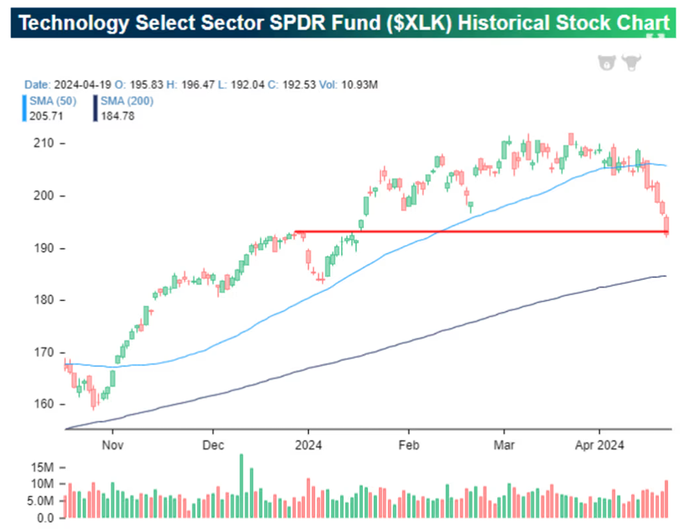 Мнение: Bespoke Investment Group. Технологические акции демонстрируют признаки "обвала" в преддверии крупных технологических доходов. Акции технологических компаний в целом демонстрировали признаки “обвала”, поскольку в этом месяце сектор переживает спад, который значительно усилился, по данным Bespoke Investment Group. Согласно рыночным данным Dow Jones, сектор информационных технологий S & P 500 упал на 7,3% на прошлой неделе, что стало самым большим недельным падением с периода, закончившегося 20 марта 2020 года. Технологический сектор - крупнейший в S & P 500, который упал на 3% на прошлой неделе. “Главным тормозом были технологии”, - говорится в аналитической записке Bespoke, отправленной по электронной почте в понедельник. Крупнейшие технологические акции Nvidia Corp. NVDA, 4.81% в понедельник утром они восстановились после резкого падения на 10% в пятницу, в результате которого акции компании упали на 13,6% на прошлой неделе. Согласно рыночным данным Dow Jones, пятница ознаменовалась крупнейшим ежедневным падением гигантского производителя чипов с марта 2020 года и худшей неделей с сентября 2022 года. Bespoke указал на биржевой фонд, фонд SPDR для технологического сектора XLK, чтобы подчеркнуть проблемы в этой области фондового рынка США. ETF, активы которого находятся под управлением примерно на 62 миллиарда долларов, завершил пятницу, и его акции за год практически не изменились. На приведенном выше графике “явно начали проявляться признаки обвала”, - сказал Bespoke. Поскольку 15 апреля ETF опустился ниже 50-дневной скользящей средней, “сектор не смог подняться в воздух”, как показано на графике. “Сейчас они торгуются ближе к своему” 200-дневному скользящему среднему", чем к 50-дневному скользящему среднему, - сказал Bespoke. [Не является индивидуальной инвестиционной рекомендацией]