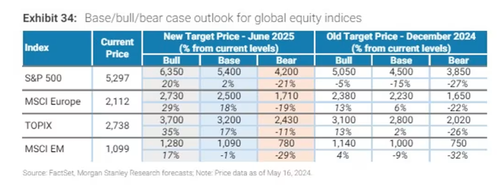 Мнение: Morgan Stanley. Один из последних оставшихся медведей Уолл-стрит, Morgan Stanley, наконец капитулировал. Фьючерсные торги понедельника указывают на то, что S & P 500, возможно, снова побьет новый рекорд. Инвесторы будут надеяться, что недавний тренд даст им толчок в течение следующих нескольких сессий, потому что календарь catalyst очень скуден до среды, когда будут опубликованы протоколы заседания Федеральной резервной системы и прибыль Nvidia. Тем не менее, решительный характер последнего ралли и настолько благоприятный экономический фон, что даже один из последних оставшихся крупных медведей рынка, похоже, сдался. В рамках среднесрочного прогноза по глобальной стратегии Morgan Stanley, опубликованного в выходные, главный стратег банка по акциям в США Майк Уилсон говорит, что он видит индекс S & P 500 SPX на уровне 5400 во втором квартале 2025 года. Это не прямое сравнение, потому что сроки разные, но предыдущий 12-месячный прогноз Уилсона предполагал, что индекс S & P 500 упадет до 4500 к четвертому кварталу этого года. Итак, как Уилсон достигает этой новой базовой цели? Что ж, первое, что следует признать, это то, что колебания мнений о том, избежит ли экономика США цикла ужесточения политики ФРС с помощью жесткого, мягкого сценария или сценария без посадки, делают разброс возможных результатов довольно широким, говорит он. “Последние пару месяцев в этом отношении были микромиром, поскольку данные по экономическому росту в очередной раз остыли после периода роста, в то время как данные по инфляции были неустойчивыми”, - говорит Уилсон. “Короче говоря, макроэкономические результаты становится все труднее предсказывать, поскольку данные становятся все более волатильными”. Тем не менее, базовый сценарий Уилсона заключается в росте прибыли на 8% в 2024 году и 13% в 2025 году, чему способствуют рост выручки и расширение маржи. Таким образом, ко второму кварталу 2025 года коэффициент соотношения цены и прибыли на 12 месяцев вперед для S & P 500 в 19 раз превысит совокупную прибыль за июнь 2026 года в 283 доллара, что составляет 5400. Применяемый коэффициент снизится примерно с 20 до примерно 19 в базовом варианте из-за такой “скромной оценки compression...as более высокая корректировка прибыли типична для периода от середины до конца цикла (это произошло в середине 1990-х, середине 2000-х и совсем недавно в 2018 году).” То, что Уилсон называет нормализацией рыночного мультипликатора, также является функцией более высокой премии за риск, применяемой к акциям, что отражает неопределенность в отношении более широкого диапазона результатов, отмеченных ранее. И из-за этого разница между его бычьими и медвежьими прогнозами довольно велика. Согласно первому прогнозу, индекс S & P 500 составит 6350 долларов ко второму кварталу 2025 года, что требует роста прибыли на акцию на 11-15%, увеличившись в 21 раз. В следующем году "Медвежий" прогноз приведет к жесткой посадке, что приведет к сокращению EPS и многократному сжатию до целевого показателя в 4200. “На наш взгляд, неопределенный фон, с которым мы сталкиваемся, требует инвестиционного подхода, который может сработать, поскольку рыночное ценообразование и лидерство в секторе / факторе зависят от потенциальных результатов”, - говорит Уилсон. Поэтому он рекомендует купить “качественную циклическую штангу”, которая будет эффективнее при сценарии без приземления, и обес