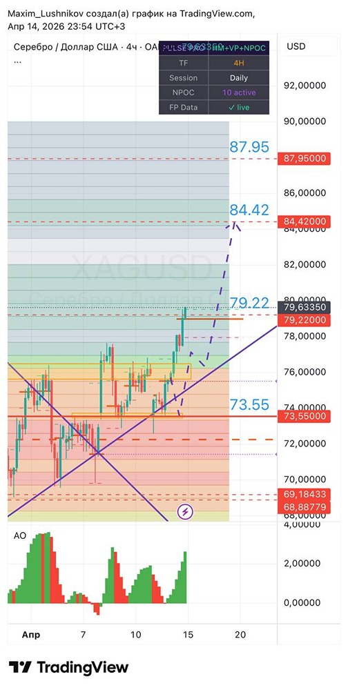 Серебро наконец-то сломало ту наклонную, которая давила с самого верха. От базы 73.55 пошёл хороший импульс, и сейчас мы закрепились выше 79.22 — это важный уровень, тут и NPOC сидит. Зашёл в лонг от ~79.60, руками, по рынку. Цели: 1. 84.42 2. 87.95 3. 102.00 — это уже глобально, с дневки По рискам: Откат в зону 76–77 перед продолжением — вполне допускаю, это нормальный ретест. Но если уйдём обратно под 73.55 и закрепимся — сетап ломается, буду выходить. На 4-часах пока всё чисто: моментум есть, AO подтверждает. Пока держимся выше 79.22 — работаю в лонг. Данный материал носит информационный характер и [не является индивидуальной инвестиционной рекомендацией](https://mondiara.com/communities?open=community-1163) или предложением о покупке или продаже указанной ценной бумаги. Источник: Максим Лушников | Трейдинг и Инвестиции
