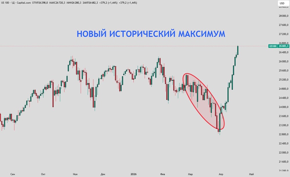 Вижу, что много людей хотят узнать про индикатор, который намекает на то, что ситуация на Ближнем Востоке близка к завершению! Этот индикатор — американский фондовый рынок. Посмотрите на графике индекса Nasdaq. Индекс считается главным индикатором «технологического» рынка, так как в нем преобладают компании из сфер IT, биотехнологий и интернета. Это флагман американского фондового рынка, который как тащит за собой в космос, так и может хорошо укатать вниз все остальные сектора. Красным овалом я вам показал начало конфликта на Ближнем Востоке, когда был непонятен трек по Ирану. То наземная операция, то еще что-то. Однако последние 19 дней рынок растет без остановки. А на этой неделе вообще обновили исторические максимумы! Нужно понимать, что проф. участники американского фондового рынка, наверное, одни из самых осведомленных во всем мире. Да, они тоже в моменте в шоке от поведения Трампа, но глобально они так или иначе понимают, куда движется внешнеполитический контур США на самом деле. На кону стоят огромные капиталы, поэтому им принципиально важно понимать, что ожидать от Трампа в ближайшей перспективе. Такой рост с обновлением исторических максимумов, по сути, может иметь 2 причины: ➥ Это финальный вынос перед какой-то глобальной коррекцией/кризисом на рынке. Судя по тому, что кризис по рынку США ждут с 2020 года, это маловероятно. Вера в ИИ пока непоколебима. ➥ Это нормализация ситуации в Иране и, как следствие, ликвидация фактора неопределенности на рынке. Простыми словами, проф. участники США получили сигнал от администрации Трампа, что заварушка в Иране закругляется, так как иначе придется надолго заходить, и из такого сценария победителем выйти будет очень сложно. А это слома влияния мирового гегемона, что в контексте войны империй будет на руку Китаю! Поэтому они успокоились и начали покупать наперед, пока еще в СМИ обсуждаются противоречия и обоюдные репутационные удары между США и Ираном. Этот вариант более вероятный, несмотря на то, что в СМИ еще сохраняется повестка о закрытии Ормузского пролива или потенциальном закрытии Баб-эль-Мандебского пролива. Не забывайте смотреть на графики американского рынка. Это хороший источник информации, которой нет пока в СМИ. Данный материал носит информационный характер и [не является индивидуальной инвестиционной рекомендацией](https://mondiara.com/communities?open=community-1163) или предложением о покупке или продаже указанной ценной бумаги. Источник: Вячеслав Таквель (Goodwin)
