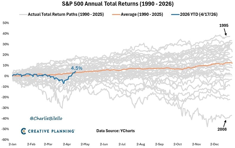 30 марта индекс S&P 500 продемонстрировал падение на 7% с начала 2026 года, что стало 12-м худшим началом года в истории. После одного из самых значительных трехнедельных ралли за всю историю индекс сейчас вырос на 4,5% с начала года и превысил среднегодовой показатель на данный момент (+3%). На рынках нет ничего невозможного.