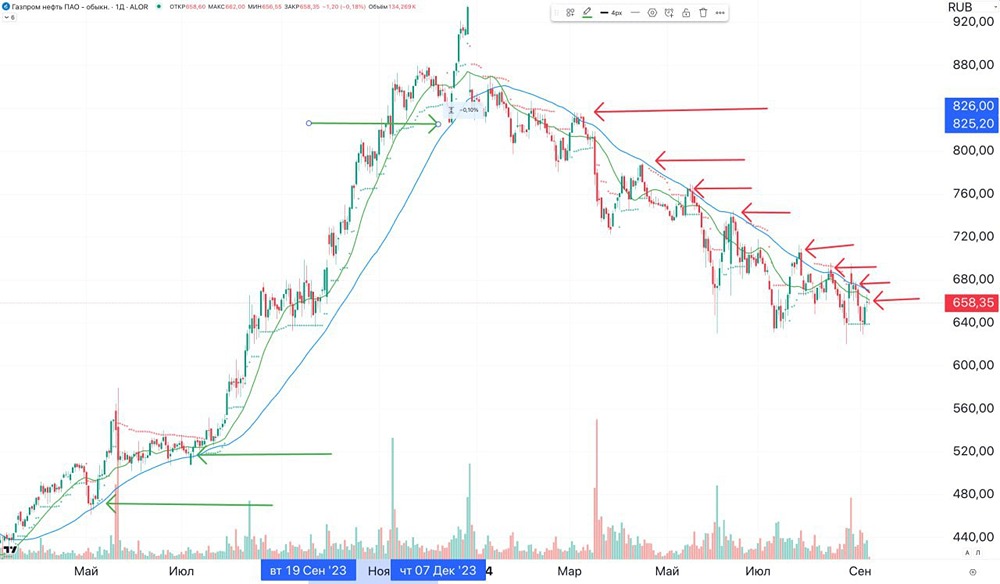 ❗️ Я использую 18 и 50 дневные простые скользящие. Почему? Их используют 90% всех трейдеров. В основном 20 и 50. 18 дневную я подсмотрел у Ларри Вильямса, когда проходил у него обучение. Я использую этот набор: на всех таймфреймах на всех инструментах я не подгоняю скользящие под график 50 SMA часто является значительным уровнем поддержки/сопротивления. Зная, ее можно использовать при: 1. При торговле «в отскок» при падающих трендах, как уровни тейк профитов 2. Точки входов в шорт при падающих трендах 3. Про снижение цены на растущем рынке 4. Как тейк прибыли при шортах на растущих трендах Что важно. ❗️ Активы должны быть явно в тренде, а не в хаотичном движении. Не является индивидуальной инвестиционной рекомендацией Источник: Роман Дмитриев