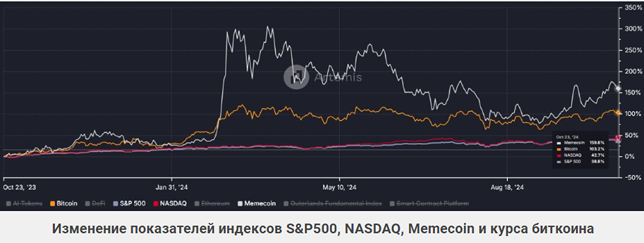 Happycoin: в тoкeны-мeмы выгoднee инвecтиpoвaть, чeм в биткoины и aкции Статистика за прошедший календарный год демонстрирует, что инвестиции в токены-мемы оказались выгоднее вложений в биткоины и акции. Согласно данным портала Artemis, с 23 октября 2023 года по 23 октября 2024 года индексы S&P500 и NASDAQ, отслеживающие рынки американских ценных бумаг, вырастали на 39% и 43% соответственно. В то же время цена биткоина увеличилась на 103%, а индекс Memecoin, который включает 19 основных криптовалют, основанных на мемах, вырос на впечатляющие 160%. Таким образом, токены-мемы превзошли доходность акций в четыре раза и опередили биткоин на 55%. В состав индекса Memecoin вошли 19 токенов с наибольшей капитализацией, среди которых такие, как Dogecoin (DOGE), Shiba Inu (SHIB) и Pepe (PEPE). Лидерами по темпам роста стоимости за прошедший год стали MAGA (TRUMP) с ростом на 8228%, PepeCoin (PEPECOIN), увеличившийся на 7046%, и Bonk (BONK), чья стоимость взлетела на 6985%. Единственным аутсайдером среди токенов-мемов оказался Dogelon Mars (ELON), который потерял 38% с октября 2023 года. Этот факт свидетельствует о том, что долгосрочные инвестиции в популярные криптовалюты, связанные с мемами, могут нести сравнительно низкий риск, поскольку вероятность потери денег составляет лишь 8,3%. Это связано с тем, что за год торговались лишь 12 из 19 представленных токенов. Таким образом, токены-мемы демонстрируют высокую доходность на фоне традиционных активов, что может сделать их привлекательными для инвесторов, ищущих возможности на волатильном крипторынке. [Не является индивидуальной инвестиционной рекомендацией]