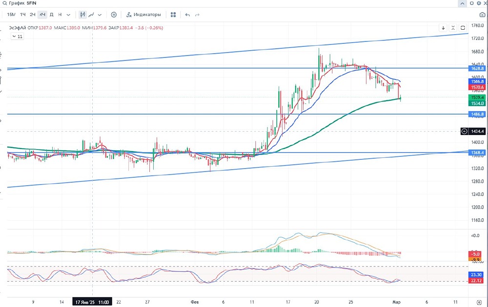 Добрый день уважаемые дамы и господа, инвесторы и трейдеры! 🚨 Публичный диверсифицированный инвестиционный холдинг, портфель активов которого состоит из российских компаний, занимающих ведущие места в своих сегментах рынка. SFI объединяет лизинговые и страховые активы, ИТ-стартапы, инвестирует в крупные миноритарные доли промышленных и розничных компаний. ✅Позитив: 📍1. Программа льготного лизинга в России может стимулировать спрос на отечественные автомобили 📍2. SFI полностью погасил остаток задолженности в размере ₽9,7 млрд по кредитному договору 📍3. Холдинг, внутри есть компании которые в сумме могут стоить кратно дороже, чем отдельно ЭсЭфАй ⛔Негатив: 📍1. Текущий уровень задолженности увеличился за 5 лет. 📢Дополнительно: 🥇1. Чистая прибыль «ЭсЭфАй» по МСФО за 9 месяцев 2024 года составила ₽19,337 млрд, увеличившись на 16,5% по сравнению с ₽16,603 млрд в предыдущем году. 🥈2. Чистый процентный доход увеличился на 62,6% до ₽19,857 млрд против ₽12,21 млрд годом ранее. 💵Дивиденды: Согласно дивидендной политике ЭсЭфАй целевой уровень дивидендных выплат составляет не менее 75% от минимального показателя из размера чистой прибыли по РСБУ или размера свободного денежного потока за отчетный год при условии наличия поступлений дивидендных выплат от дочерних/зависимых обществ. 💴 - $SFIN: ФА Капитализация - 59.8 млрд ₽ Кол-во акций ао– 111.6 млн Кол-во акций ап– 0.0 млн Р/Е - 3.07 P/S - 1.77 P/BV - 0.74 ROE - 23.9% EV/EBITDA - 0.0 DSI 0.14 💡Данные взяты из официальных и публичных источников и отражают состояние за базовый год, а не на момент публикации поста. ⏰ - ТФ 1 DAY 🛠 ТА - скользящие, стохастик, объем, МАСD, уровни. 📈- тренд вверх ‼- Гистограмма MACD в положительных значениях, линии MACD находятся в положительных значениях. Стохастик находится в зоне перекупленности, но пытается выйти из нее. 11 февраля цена пересекла снизу вверх 100 ЕМА и показывает восходящую тенденцию. При закрытии дня ниже 1515,9 возможен разворот в шорт. Вероятно, что после данного роста цена может опуститься до 1490-1470. Если закроются ниже 1534, то падение может быть немного глубже ⏰ -ТФ 4 часа 🛠 ТА - скользящие, стохастик, объем, МАСD, уровни. 📈- тренд вниз ‼ - Гистограмма MACD в отрицательных значениях, линии MACD находятся в отрицательных значениях. Стохастик находится у зоны перепроданности. При закрытии выше 1586,8 возможен разворот в лонг. 📊За 6 (09.24-02.25) месяцев цена выросла более чем на 36 % . Мин. Рrice = 1056,0 Мах. Рrice = 1691.0 📌 Цены смены тренда указаны в соответствии с ТФ и являются ориентировочными и со временем смещаются.📌 🃏Всем профита и до скорой встречи!🃏