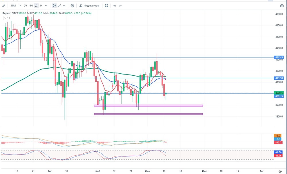 🚨 Разбор «Яндекс»✅ Добрый день, уважаемые дамы и господа, инвесторы и трейдеры! 🚨 «Яндекс» — российская транснациональная компания в отрасли информационных технологий, чьё головное юридическое лицо зарегистрировано в Калининградской области Российской Федерации, владеющая одноимённой системой поиска в интернете, интернет-порталом и веб-службами в нескольких странах. ✅Позитив: 📍1. Рост рынка цифровых книг в России на 37% до 19,72 млрд рублей в 2024 году 📍2. Запуск программы кредитования для селлеров на маркетплейсе 📍3. Приобретение компании 'Домиленд' для цифровизации жилой недвижимости 📍4. Диверсификация бизнеса 📍5. Обширная экосистема сервисов (почта, диск, музыка, кинопоиск, маркет, финтех) ⛔Негатив: 📍1. Риски от разработки DeepSeek 📍2. Геополитические риски 📍3. Затруднен доступ к передовым западным технологиям 📍4. Конкурентное давление 📍4. Замедление экономики , инфляция 📢Дополнительно: 🥇1. Убыток «Яндекса» по МСФО за 3 месяца 2025 года составил ₽10,8 млрд против прибыли ₽20,1 млрд в предыдущем году. 🥈2.Выручка увеличилась на 34,3% до ₽306,5 млрд против ₽228,3 млрд годом ранее. 🥉3. Акционеры «Яндекса» утвердили дивиденды по итогам 2024 года в размере ₽80 на одну обыкновенную акцию. 💵Дивиденды: Дивидендная политика Яндекса не содержит конкретных указаний на порядок определения дивидендов. Компания планирует осуществлять дивидендные выплаты два раза в год. 💴 - $YDEX : ФА Чистые активы - 293.8 млрд ₽ Кол-во акций ао– 390.5 млн Кол-во акций ап– 0.0 млн Р/Е - 15.4 P/S - 1.42 P/BV - 14.0 ROE - 34,3% EV/EBITDA - 8.49 DSI = 0.21 Данные взяты из официальных и публичных источников и отражают состояние 2024 , а не на момент публикации поста. ⏰ - ТФ 1 DAY 🛠 ТА - скользящие, стохастик, объем, МАСD, уровни. 📈- тренд вниз ‼- Гистограмма MACD в отрицательных значениях, линии MACD находятся в положительных значениях. Стохастик находится чуть выше средней линии. 9 июня цена пересекла сверху вниз 100 ЕМА и показывает нисходящую тенденцию. При закрытии дн выше 4084,4 возможен разворот в лонг. ⏰ -ТФ 4 часа 🛠 ТА - скользящие, стохастик, объем, МАСD, уровни. 📈- тренд вверх ‼ - Гистограмма MACD в отрицательных значениях, линии MACD находятся в отрицательных значениях. Стохастик находится в зоне перепроданности. 9 июня цена пересекла сверху вниз 100 ЕМА и показывает нисходящую тенденцию. При закрытии выше 4084,4 возможен разворот в лонг. 📈- Вероятное развитие событий: На данный момент похоже, что актив пытается развернуться. Закрепление выше уровня 4001,5 будет хорошим знаком. При смене локального тренда на 4Н и закреплении выше диапазона 4122-4137 есть шанс на поход до 4320. Внизу есть две сильных зоны, упасть ниже которых, вероятно не дадутю За 6 (12.24-05.25) месяцев цена выросла более чем на 20 % . Мин. Рrice = 3191 Мах. Рrice = 4794.5 📌 Цены смены тренда указаны в соответствии с ТФ и являются ориентировочными и со временем смещаются.📌 🃏Всем профита и до скорой встречи!🃏