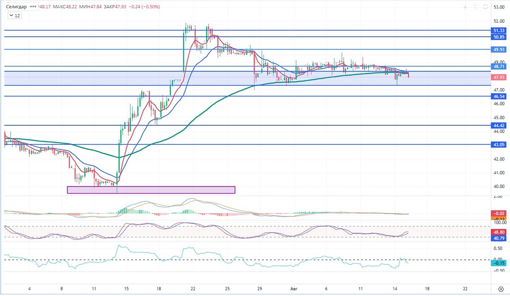 🚨Разбор ПАО «Селигдар»🚨 Добрый день, уважаемые дамы и господа, инвесторы и трейдеры! 🚨ПАО «Селигдар» консолидирует акции золотодобывающих предприятий, осуществляющих деятельность в Республике Саха (Якутия), Республике Бурятия, Алтайском и Хабаровском краях, Оренбургской области. С 2013 года в структуру Холдинга входят также оловодобывающие активы в Хабаровском крае. Головной офис компании расположен в г. Алдане, Республика Саха (Якутия). Холдинг специализируется на разработке небольших и средних по запасам месторождений золота, преимущественно с невысокими содержаниями (1-2 г/т), отрабатываемых открытым способом и последующим извлечением полезного компонента методом кучного выщелачивания. Оловодобывающие активы Холдинга представлены месторождением Правоурмийское, на котором осуществляется добыча руды подземным способом, и двумя месторождениями бывшего Солнечного ГОКа – Фестивальным и Перевальным – на которых осуществляются работы по реконструкции и подготовка к возобновлению добычи руды и производству оловянного концентрата. ✅Позитив: 📍1. Компания входит в рейтинг крупнейших поставщиков золота 📍2. Крупнейший производитель рудного олова в России 📍3. Высокие цены на золото 📍4. Запуск новой золотоизвлекательной фабрики на месторождении Хвойное ⛔Негатив: 📍1. Рост чистого долга 📍2. США включили компанию «Золото Селигдара» в санкционный список. 📢Дополнительно: 🥇1. Производство золота холдингом «Селигдар» за 6 месяцев 2025 года составило 2,78 тонн, увеличившись на 0,1% по сравнению с прошлым годом. 🥈2. Производство олова выросло на 41%, до 1,72 тыс. тонн. Производство меди увеличилось на 29% до 1,23 тыс. тонн. Консолидированная выручка от продажи металлов выросла на 40%, до ₽28,4 млрд. 🥉3. РСБУ 1п 2025г: Выручка ₽1,17 млрд (+61,3% г/г), чистая прибыль ₽64,2 млн 💵Дивиденды: Согласно действующей дивидендной политике Селигдар будет стремиться направлять на выплату дивидендов не менее 30% прибыли по МСФО. При этом целевые значения выплат зависят от уровня долга компании (чистый долг/EBITDA). Если чистый долг/EBITDA < 1, то на дивиденды направляется 30% прибыли. Если чистый долг/EBITDA от 1 до 2, то - 20%. Если чистый долг/EBITDA от 2 до 3, то - 10%. Если чистый долг/EBITDA > 3, то дивиденды не выплачиваются. Стабильность дивидендов сложно прогнозируема. Возможно улучшение ситуации когда или если компания снизит долг ниже 2х по коэффициенту чистый долг/EBITDA. 💴 - $SELG : ФА Чистые активы - 19.4 млрд ₽ Кол-во акций ао–1030.0 млн Кол-во акций ап– 0.0 млн Р/Е - 7.86 P/S - 0.73 P/BV - 2.27 ROE - 28,3% EV/EBITDA - 5.28 DSI = 0.43 Данные взяты из официальных и публичных источников и отражают состояние 2024 , а не на момент публикации поста. ⏰ - ТФ 1 DAY 🛠 ТА - скользящие, стохастик, объем, МАСD, уровни. 📈- тренд вверх ‼- Гистограмма MACD в отрицательных значениях, линии MACD находятся в положительных значениях. Стохастик ниже средней линии и падает. 18 июля цена пересекла снизу вверх 100 ЕМА и показывает восходящую тенденцию. При закрытии дня ниже 48,17 возможен разворот в шорт. ⏰ - ТФ 4Н 🛠 ТА - скользящие, стохастик, объем, МАСD, уровни. 📈- тренд вниз ‼- Гистограмма MACD в отрицательных значениях, линии MACD находятся в отрицательных значениях. Стохастик ниже средней линии и растет. 15 августа цена пересекла снизу вверх 100 ЕМА и показывает восходящую тенденцию. При закрытии дня ниже 48,36 возможен разворот в шорт. 📈 Возможные варианты развития: При 