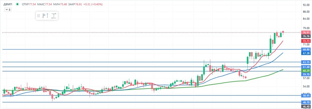 Пойдёт ли ДВМП к 80 руб.? Анализируем восходящий тренд и зону перекупленности