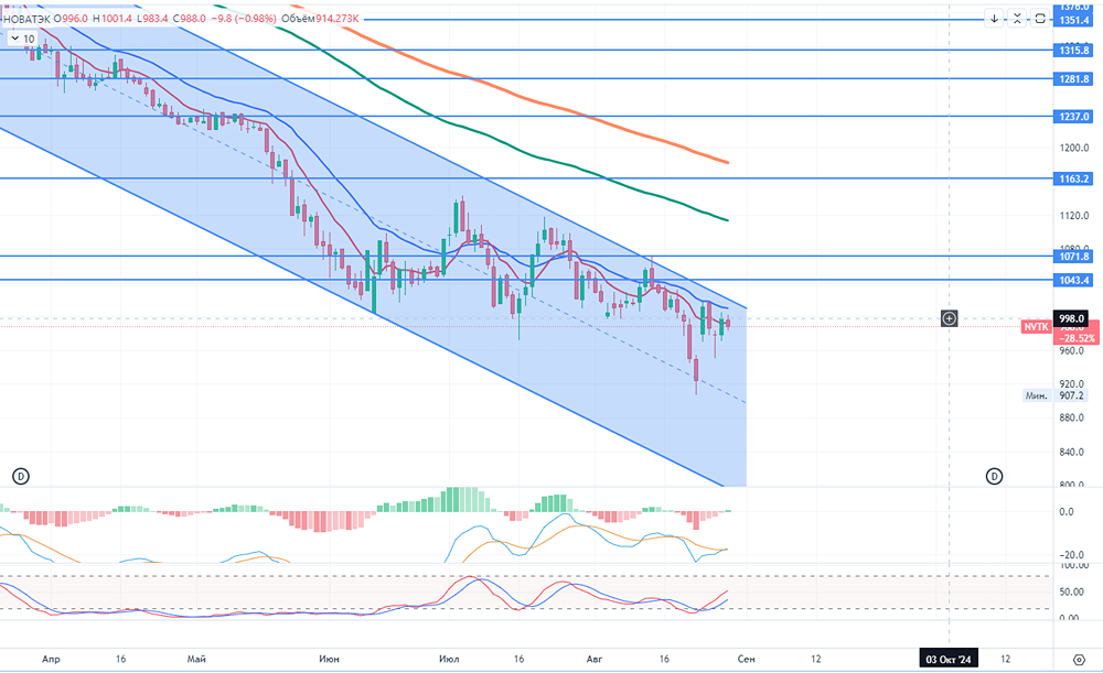 Добрый день уважаемые дамы и господа, инвесторы и трейдеры! 🚨 ПАО «НОВАТЭК» является крупнейшим независимым производителем природного газа в России. Компания занимается разведкой, добычей, переработкой, реализацией природного газа, жидких углеводородов и имеет двадцатипятилетний опыт работы в российской нефтегазовой отрасли. Основные месторождения и лицензионные участки расположены в Ямало-Ненецком Автономном Округе (ЯНАО) в Западной Сибири. ЯНАО является крупнейшим в России регионом по добыче природного газа, на долю которого приходится около 80% российской добычи природного газа и приблизительно 15% мирового объема добычи газа. «НОВАТЭК» реализует природный газ на территории Российской Федерации, а также на экспорт в форме СПГ. ✅Позитив: 📍1. Ожидаемый рост потребления природного газа в Китае на 6,5-7,7% в 2024 году 📍2. Увеличение тарифов на газ ⛔Негатив: 📍1. Возможный рост капитальных затрат. 📍2. Внешние ограничения в виде санrций. 📍3. Отложение сейсморазведки на Южно-Лескинском участке до 2031 📍4. Задержки в строительстве третьей линии завода Arctic LNG 2 📢Дополнительно: 🥇1. Чистая прибыль «Новатэка» по МСФО за 6 месяцев 2024 года составила ₽345,44 млрд, увеличившись в 2,2 раза по сравнению с ₽158,17 млрд в предыдущем году. Выручка выросла на 17% до ₽752,4 млрд против ₽642,98 млрд годом ранее. 🥈2 Компания «Новатэк» начал транспортировку второй технологической линии сжижения для проекта «Арктик СПГ-2» из Мурманска. Платформу отбуксируют на Гыдан, где ориентировочно в середине августа, начнется ее установка на терминале «Утренний», близ ресурсной базы проекта. 🥉3. Отгрузки с первой линии СПГ-завода, которая была готова к запуску ещё в декабре прошлого года, из-за санкций США пока не начались. 💵Дивиденды: Дивидендная политика Новатэка: не менее 50% от консолидированной чистой прибыли по МСФО, скорректированной на статьи, не относящиеся к основной деятельности и неденежные статьи. Платят дважды в год. Совет директоров «Новатэка» рекомендовал выплатить дивиденды по итогам 6 месяцев 2024 года в размере ₽35,5 на одну обыкновенную акцию. Последний день покупки бумаг для получения дивидендов — 10 октября 2024 года. Дивидендная доходность может составить 3,6%. 💴 - $NVTK: ФА Капитализация - 3004.0 млрд ₽ Кол-во акций – 3036.0 млн Р/Е - 4.42 P/S - 1.98 P/B - 1.1 ROE - 23.2% EV/EBITDA - 3.3 ⏰ - ТФ 1 DAY 🛠 ТА - скользящие, стохастик, объем, МАСD, уровни. 📈- тренд вниз ‼- Гистограмма MACD вышла в положительные значения, линии MACD находятся в отрицательных значениях. Стохастик находится у средней линии. 15 ноября 2023 цена пересекла сверху вниз 100 ЕМА и показывает нисходящую тенденцию. При закрытии выше 1009,7 возможен разворот в лонг. ⏰ -ТФ 4 часа 🛠 ТА - скользящие, стохастик, объем, МАСD, уровни. 📈- тренд вверх ‼ - Гистограмма MACD в положительных значениях, линии MACD находятся в положительных значениях. Стохастик находитсяв районе зоны перекупленности. При закрытии выше 1008 возможен импульс на дальнейший уверенный рост, а вот закрытие ниже 954,8 не желательно. За 6 (02.24-07.24) месяцев цена снизилась более чем на 27 % . Мин. Рrice = 972,2 Мах. Рrice = 1499.8 📌 Цены смены тренда указаны в соответствии с ТФ и являются ориентировочными и со временем смещаются.📌 🃏Всем профита и до скорой встречи!🃏