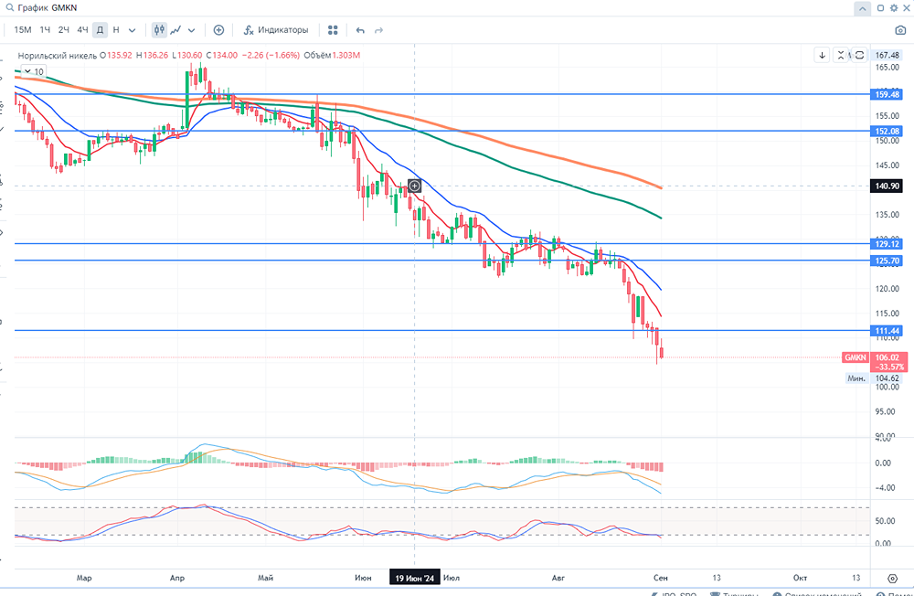 Добрый день уважаемые дамы и господа, инвесторы и трейдеры! 🚨ПАО «Норникель» — российская горно-металлургическая компания. В настоящее время «Норникель» объединяет группу предприятий, возглавляемую Публичным акционерным обществом "Горно-металлургическая компания «Норильский никель». «Норникель» является лидером горно-металлургической промышленности России, а также крупнейшим производителем палладия и рафинированного никеля и одним из крупнейших производителей платины и меди. «Норникель» производит также кобальт, родий, серебро, золото, иридий, рутений, селен, теллур и серу. Основными видами деятельности группы являются поиск, разведка, добыча, обогащение и переработка полезных ископаемых, производство, маркетинг и реализация цветных и драгоценных металлов. География поставок продукции охватывает свыше трех десятков стран. ✅Позитив: 📍1. Ожидаемое значительное высвобождение оборотного капитала к концу 2024 года может улучшить финансовое положение 📍2. Пока санкции США не затронули производственные и сбытовые компании группы Норникель ⛔Негатив: 📍1. Предполагаемый отказ от выплаты дивидендов за 2024 год 📢Дополнительно: 🥇1. Чистая прибыль ГМК «Норильский никель» по МСФО за 6 месяцев 2024 года составила $0,829 млрд, что на 22,5% ниже по сравнению с $ 1 ,07 млрд в предыдущем году. 🥈2. Выручка сократилась на 21,6% до $5,61 млрд против $7,16 млрд годом ранее. 🥉3. Объём производства никеля компанией «Норильский никель» за 6 месяцев 2024 года сократился на 1% до 90,4 тыс. тонн. Объём производства меди вырос на 7% и составил 218,57 тыс. тонн. Выпуск палладия сократился на 0,1%, составив 1 480 тыс. унций. Объём производства платины сократился на 3%, до 356 тыс. унций. Компания подтвердила план на 2024 год: 184-194 тыс. тонн никеля, 334-354 тыс. тонн меди, 2,3 - 2,45 млн унций палладия и 567-605 тыс. унций платины. 💵Дивиденды: Действующая ранее дивидендная политика Норильского никеля с привязкой к EBITDA по соглашению с РУСАЛом прекратила свое действие 1 января 2023 года. 💴 - $GMKN : ФА Капитализация - 1650.0 млрд ₽ Кол-во акций – 15286.0 млн Р/Е - 6.99 P/S - 1.4 P/B - 3.0 ROE - 30.0% EV/EBITDA - 4.0 ⏰ - ТФ 1 DAY 🛠 ТА - скользящие, стохастик, объем, МАСD, уровни. 📈- тренд вниз ‼- Гистограмма MACD в отрицательных значениях, линии MACD находятся в отрицательных значениях. Стохастик входит в зону перепроданности. 23 апреля цена пересекла сверху вниз 100 ЕМА и показывает нисходящую тенденцию. При закрытии дня выше 119,71 возможен разворот в лонг, однако первый импульс на лонг это закрытие выше 118,44. ⏰ -ТФ 4 часа 🛠 ТА - скользящие, стохастик, объем, МАСD, уровни. 📈- тренд вниз ‼ - Гистограмма MACD в отрицательных значениях, линии MACD находятся в отрицательных значениях. Стохастик в зоне перепроданности. 14 августа цена пересекла сверху вниз 100 ЕМА и показывает нисходящую тенденцию. При закрытии дня выше 110,72 возможен разворот в лонг. 📊За 6 (02.24-07.24) месяцев цена снизилась более чем на 25 % . Мин. Рrice = 104,62 Мах. Рrice = 167.48 📌 Цены смены тренда указаны в соответствии с ТФ и являются ориентировочными и со временем смещаются.📌 🃏Всем профита и до скорой встречи!🃏