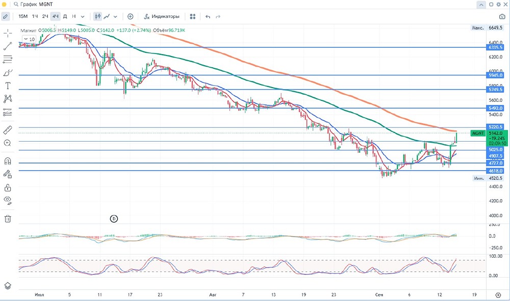 Добрый день уважаемые дамы и господа, инвесторы и трейдеры! 🚨«Магнит» является одной из ведущих розничных сетей в России по торговле продуктами питания, лидером по количеству магазинов и географии их расположения. Компания представлена в около 4 000 населенных пунктах, ежедневно магазины компании посещают почти 16 миллионов человек. «Магнит» работает в мультиформатной модели, которая включает в себя магазины у дома, супермаркеты, аптеки и магазины дрогери. «Магнит» является уникальной компанией в российском ритейле. Наряду с продажей товаров розничная сеть занимается производством продуктов питания под собственными торговыми марками. Компания управляет несколькими предприятиями по выращиванию овощей, производству бакалеи и кондитерских изделий. «Магнит» владеет тепличным и грибным комплексами, которые являются одними из крупнейших в России. ✅Позитив: 📍1. Запуск нового формата 'жестких' дискаунтеров 'Ценохит' на Дальнем Востоке в сотрудничестве с розничной сетью 'Самбери' может привести к увеличению доходов 📍2. Предполагаемый рост оборота десяти крупнейших ритейлеров 📍3. Есть потенциал к росту в счет запуска аптечного маркетплейса ⛔Негатив: 📍1. Повышение отпускных цен производителями продуктов питания может привести к увеличению себестоимости товаров для розничных сетей 📍2. Возможный отток в акции Х5 после редомициляции 📢Дополнительно: 🥇1. Чистая прибыль «Магнита» по МСФО за 6 месяцев 2024 года составила ₽17,5 млрд, снизившись в 2 раза по сравнению с ₽34 млрд в предыдущем году. 🥈2. Выручка выросла на 18,7% до ₽1,46 трлн против ₽1,23 трлн годом ранее. 🥉3. Долг вырос за счет байбека и выплаты дивидендов + КАПЕКС растет(экспансия, которая пока не дает нужного результата 💵Дивиденды: Дивидендная политика Магнита не содержит конкретных указаний на порядок определения дивидендов. Менеджмент планирует осуществлять дивидендные выплаты два раза в год - в июне и январе (за 4кв и за 9 месяцев - фактически, исходя из полугодовых результатов). 💴 - $MGNT : ФА Капитализация - 508.7 млрд ₽ Кол-во акций – 101.9 млн Р/Е - 12.09 P/S - 0.18 P/B - 7.2 ROE - 31.4% EV/EBITDA - 4.1 ⏰ - ТФ 1 DAY 🛠 ТА - скользящие, стохастик, объем, МАСD, уровни. 📈- тренд вверх ‼- Гистограмма MACD в положительных значениях, линии MACD находятся в положительных значениях. Стохастик вышел из зоны перепроданности. Такое поведение осциллятора может свидетельствовать о прекращении тенденции к снижению цены и переходе к росту. 31 мая цена пересекла сверху вниз 100 ЕМА и показывает нисходящую тенденцию. При закрытии дня ниже 4805,7 возможен разворот в шорт. ⏰ -ТФ 4 часа 🛠 ТА - скользящие, стохастик, объем, МАСD, уровни. 📈- тренд вниз ‼ - Гистограмма MACD в положительных значениях, линии MACD находятся в положительных значениях и движутся вверх. Стохастик выше средней линии. Все это свидетельствует о том, что на данный момент ожидается продолжение восходящего движения. Далее цель пересечь 100ЕМА и 200ЕМА 21 мая цена пересекла сверху вниз 100 ЕМА и показывает нисходящую тенденцию. При закрытии ниже 4853,3 возможен разворот в шорт. 📊За 6 (03.24-08.24) месяцев цена снизилась более чем на 41 % . Мин. Рrice = 4673,0 Мах. Рrice = 8488.0 📌 Цены смены тренда указаны в соответствии с ТФ и являются ориентировочными и со временем смещаются.📌 🃏Всем профита и до скорой встречи!🃏