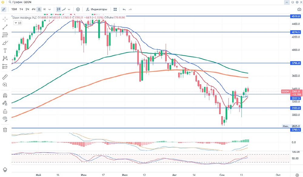 Добрый день уважаемые дамы и господа, инвесторы и трейдеры! 🚨 OZON — старейший российский универсальный интернет-магазин; второй по обороту онлайн-магазин России. Компания появилась в 1998 году. Ozon - платформа для продажи потребительских товаров различных категорий через мобильное приложение Ozon и веб-сайт Ozon. Ozon travel - онлайн-сервис для бронирования авиа- и железнодорожных билетов, а также организации деловых поездок. ✅Позитив: 📍1. Увеличение чистой прибыли на 4,4 раза год к году 📍2. Запуск маркетплейсов в других странах 📍3. Увеличение инвестиций в логистические комплексы ⛔Негатив: 📍1. Низкий спрос на онлайн-продажи лекарств 📍2. Уход всех независимых директоров из совета директоров 📢Дополнительно: 🥇1. Ozon при поддержке правительства Саратовской области планирует в 2024 году запустить в Саратове новый логистический комплекс площадью 80 тыс. к. м. 🥈2. Маркетплейс Ozon открыл в Санкт-Петербурге новый фулфилмент-центр площадью более 40 тыс. кв. м. 🥉3. Вероятно, даже после выхода на операционную прибыль компания останется убыточной, тк будет инвестировать в КАПЕКС. 💵Дивиденды: Отсутствуют 💴 - $OZON : ФА Капитализация - 709.8 млрд ₽ Кол-во акций – 216.4 млн Р/Е - (-16.6) P/S - 1.48 P/B - (-10.6) ROE - 79.1% EV/EBITDA - 166.8 ⏰ - ТФ 1 DAY 🛠 ТА - скользящие, стохастик, объем, МАСD, уровни. 📈- тренд вверх ‼- Гистограмма MACD в положительных значениях, но приближается к нулевой линии, линии MACD находятся в положительных значениях, это может свидетельствовать о ослаблении лонгового движения. Стохастик находитс\я в зоне перекупленности. 26 июля цена пересекла сверху вниз 100 ЕМА и показывает нисходящую тенденцию. При закрытии дня ниже 3233,4 возможен разворот в шорт. ⏰ -ТФ 4 часа (не готово) 🛠 ТА - скользящие, стохастик, объем, МАСD, уровни. 📈- тренд вниз ‼ - Гистограмма MACD в положительных значениях, линии MACD находятся в положительных значениях. Стохастик выходит из зоны перепроданности. 13 сентября цена пересекла сниу вверх 100 ЕМА и показывает восходящую тенденцию. При закрытии ниже 3297,5 возможен разворот в шорт. За 6 (03.24-08.24) месяцев цена снизилась более чем на 7 % . Мин. Рrice = 3010,0 Мах. Рrice = 4779.5 📌 Цены смены тренда указаны в соответствии с ТФ и являются ориентировочными и со временем смещаются.📌 🃏Всем профита и до скорой встречи!🃏