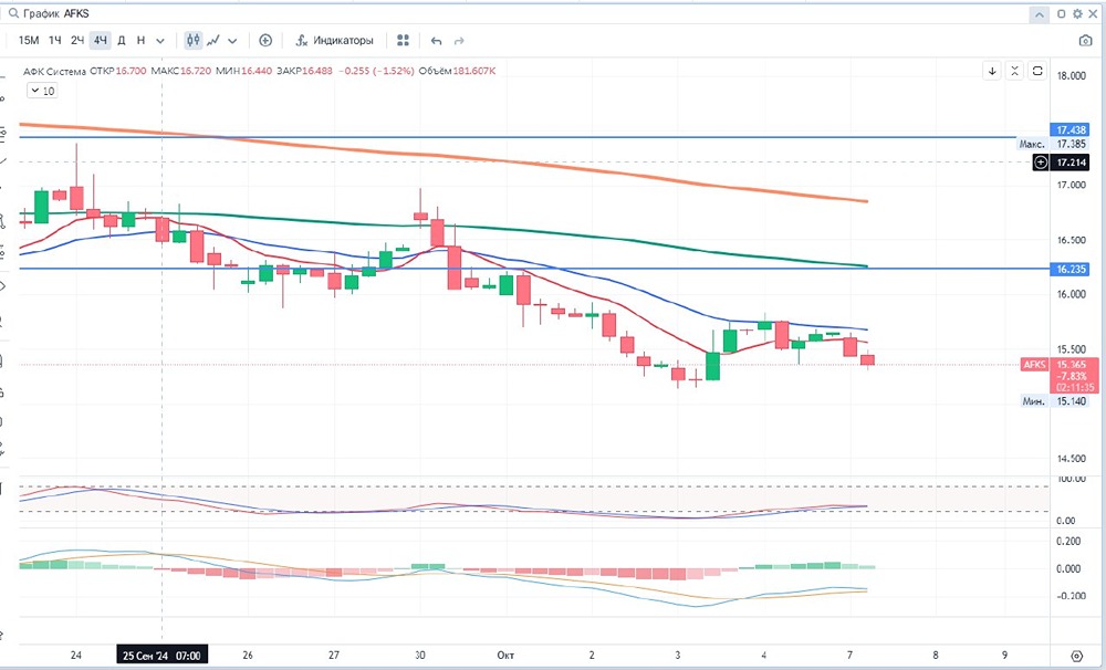Добрый день уважаемые дамы и господа, инвесторы и трейдеры! 🚨 АФК «Система» - российская публичная финансовая корпорация. Основанная в 1993 году, сегодня АФК «Система» является крупным частным инвестором в реальный сектор экономики России. Инвестиционный портфель АФК «Система» состоит преимущественно из российских компаний, представляющих различные сектора экономики, включая телекоммуникации, розничную торговлю, лесопереработку, сельское хозяйство, высокие технологии, банковские услуги, недвижимость, медицинские услуги и гостиничный бизнес. АФК «Система» – контролирующий акционер в большинстве своих бизнесов. Компетенции АФК «Система» сосредоточены в области повышения операционной эффективности приобретаемых активов за счет реструктуризации и привлечения отраслевых партнеров с целью усиления экспертизы и снижения финансовых рисков. ✅Позитив: 📍1. Планы проведения новых IPO ⛔Негатив: 📍1. Консолидированные долги компании выросли до 1,2 трлн рублей, а обслуживать их при высокой ставке тяжело. 📍2. АФК Система планирует выкупить акции Сегежи на SPOб что ухудшит финансовые показатели холдинга. 📍3. Новостройки перестали дорожать , прибыль застройщиков может снизиться 📢Дополнительно: 📍1. Чистая прибыль АФК «Системы» по МСФО за 6 месяцев 2024 года составила ₽4,41 млрд, снизившись в 5 раз по сравнению с ₽21,55 млрд в предыдущем году. 📍2. Выручка увеличилась на 24,4% до ₽574,93 млрд против ₽462,07 млрд годом ранее. 📍3. Скорректированная OIBDA «АФК Системы» за 3 месяца 2024 года составила ₽69,7 млрд, увеличившись на 7,2% по сравнению с ₽65 млрд в предыдущем году. 💵Дивиденды: Согласно дивидендной политике на 2024-2026 гг. АФК «Система» стремится выплачивать один раз в год дивиденды в размере не менее 0,52 руб. на 1 обыкновенную акцию в 2024 г., далее в 2025-2026 гг. планируется ежегодно увеличивать размер дивидендов на 25-50% относительно предыдущей выплаты. Кроме того, при существенном сокращении внешнего долга компании Совет директоров может рекомендовать направлять на выплату дивидендов до 50% от величины чистого денежного потока за отчетный год. Под чистым денежным потоком понимается сумма поступлений от монетизации инвестиций, а также дивидендов, выплачиваемых в пользу компании, уменьшенная на инвестиционные вложения, расходы на привлечение финансирования, кадровые и административно-управленческие расходы. 💴 - $AFKS : ФА Капитализация - 150.9 млрд ₽ Кол-во акций – 9650.0 млн Р/Е - (-16.7) P/S - 0.1 P/B - (-1.4) ROE - (-6.1)% EV/EBITDA - 4.6 ⏰ - ТФ 1 DAY 🛠 ТА - скользящие, стохастик, объем, МАСD, уровни. 📈- тренд вниз ‼- Гистограмма MACD в положительных значениях, но снижается, линии MACD находятся в отрицательных значениях. Стохастик находится в районе средней линии. Вероятно движение вверх до 16,285 или чуть выше с сохранением нисходящей тенденции. 26 июля цена пересекла сверху вниз 100 ЕМА и показывает нисходящую тенденцию. При закрытии дня выше 16.338 возможен разворот в лонг. ⏰ -ТФ 4 часа 🛠 ТА - скользящие, стохастик, объем, МАСD, уровни. 📈- тренд вниз ‼ - Гистограмма MACD в положительных значениях, линии MACD находятся в отрицательных значениях. Стохастик вышел из зоны перепроданности. 24 сентября цена пересекла сверху вниз 100 ЕМА и показывает нисходящую тенденцию. При закрытии выше 15,665 возможен разворот в лонг. 📊За 6 (04.24-09.24) месяцев цена снизилась более чем на 28 % . Мин. Рrice = 14,407 Мах. Рrice = 29.915 📌 Цены смены тренд