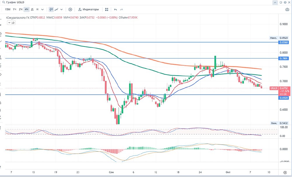 Доброго времени суток уважаемые дамы и господа, инвесторы и трейдеры! 🚨«Южуралзолото Группа Компаний» - одно из крупнейших золотодобывающих предприятий России по объёму производства и запасам. Все предприятия Группы находятся в Российской Федерации. Добыча золотосодержащей руды осуществляется как подземным, так и открытым способом. Активы предприятия включают месторождения в Челябинской области (действующие - Светлинское, Кочкарское, Березняковское, Западный Курасан, а также лицензии на геологоразведку и опытно-промышленное производство – Наилинский, Осейский, Алтын-Таш, Зайцевское), в Республике Хакасия (ОАО "Коммунаровский рудник"). Группа также разрабатывает месторождения россыпного золота в Красноярском крае (ООО АС "Прииск Дражный"). Добытая руда перерабатывается на собственных предприятиях, которые располагаются в непосредственной близости от месторождений. В состав Группы входят следующие перерабатывающие мощности: Фабрика законченного цикла обогащения (ФЗЦО) им. Артема, Кочкарская золотоизвлекательная фабрика (ЗИФ), опытно-промышленнные установки кучного выщелачивания на месторождениях Светлинское, Куросан, и Березняки в Челябинской области, Золотоизвлекательная фабрика (ЗИФ) в пос. Коммунар, в Республике Хакасия. ✅Позитив: 📍1 Высокие цены на золото являются позитивным фактором для компании. 📍2 Завершено строительство золотоизвлекательной фабрики «Высокое» 📍3 Успешное исправление выявленных нарушений безопасности на объектах компании может положительно сказаться на деятельности ⛔Негатив: 📍1 По итогам 2024 года вероятно снижение производства относительно 2023 года. 📍2 Сомнения в достижении операционных целей, заявленных в ходе IPO 📢Дополнительно: 🥇1 Производство золота компания ЮГК в 2023 году сократилось на 6,8% и составило 412,5 тыс. тройских унций, или 12,8 тонн. Снижение показателя обусловлено использованием более бедной руды со складов, и сдвигом начала производства на месторождении Высокое в Сибири на 2024 год. 🥈2 Добыча руды выросла на 30,8%, до 17,7 млн тонн. Переработка увеличилась на 3,4%, до 23,9 млн тонн. Выручка, по предварительным данным, выросла на 19%, до рекордных ₽68 млрд. 🥉3 ЮГК рассчитывает увеличить производство по итогам 2024 года на 20-30%, заявил финансовый директор компании Артем Клецкин. Значительную часть прироста обеспечит месторождение Высокое, где производство составит около 2,5-3 тонны. 💵Дивиденды: Дивиденды могут быть выплачены в размере не менее 50% от скорректированной чистой прибыли при условии, что коэффициент долговой нагрузки компании (чистый долг Net Debt/ EBITDA скорр.) не превышает 3,0х. Если коэффициент долговой нагрузки компании превышает 3,0х, дивиденды не выплачиваются 💴 - $UGLD: 🛠 ФА Капитализация - 154.9 млрд ₽ Кол-во акций ао - 200100.0 млн Р/Е - 16.37 P/S - 2.13 P/B - 4.3 ROE - 2.1% EV/EBITDA - 5.6 ⏰ - ТФ 1 DAY 🛠 ТА - скользящие, стохастик, объем, МАСD, уровни. 📈- тренд вниз ‼ - Гистограмма MACD в отрицательных значениях, линии MACD находятся в отрицательных значениях, это может сигнализировать о том, что бумага может продолжить нисходящую тенденцию.. Стохастик находится выше средней линии и снижается. 22 июля цена пересекла сверху вниз 100 ЕМА и показывает нисходящую тенденцию, хотя в данный момент эта тенденция ослабевает. При закрытии дня выше 0,7116 возможен разворот в лонг. ⏰ - ТФ 4 часа 🛠 ТА - скользящие, стохастик, объем, МАСD, ур
