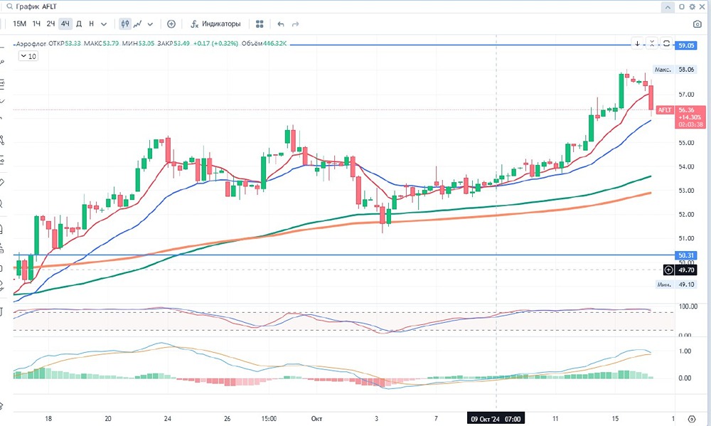 Доброго времени суток уважаемые дамы и господа, инвесторы и трейдеры! 🚨АЭРОФЛОТ является лидером гражданской авиации России, национальным перевозчиком. Аэрофлот, основанный 17 марта 1923 года, является самым сильным брендом среди ведущих российских корпораций . Аэрофлот базируется в московском аэропорту Шереметьево, 31 мая 2021 года открыл свой второй международный хаб в Красноярске. В России имеет также еще четыре филиала: в Санкт-Петербурге, Калининграде, Перми и Владивостоке. ✅Позитив: 📍1 Публикация информации о возможной выплате дивидендов 📍2 Планы группы Аэрофлот увеличить перевозки 📍3 Создание единого учебно-летного отряда группы компаний ⛔Негатив: 📍1 Рост стоимости авиабилетов на 15% за 8 месяцев 2024 года может негативно повлиять на спрос на авиаперевозки 📢Дополнительно: 🥇1 Группа «Аэрофлот» в сентябре 2024 года перевезла 5,343 млн пассажиров, что на 16,4% больше по сравнению с 4,589 млн пассажиров годом ранее. 🥈2 Пассажирооборот вырос на 16,7%, до 14,17 млрд пкм. Занятость кресел увеличилась на 1,7 п.п., составив 90,6%. По итогам 9 месяцев пассажиропоток составил 42,5 млн пассажиров, увеличившись 18,7%. 🥉3 Пассажирооборот вырос на 23,3%, до 113,95 млрд пкм. Занятость кресел увеличилась на 2,2 п.п. и составила 89,8%. 💵Дивиденды : Дивидендная политика Аэрофлота предполагает выплату минимум 25% от чистой прибыли по МСФО. Добавим, что существуют требования правительства к госкомпаниям - выплаты 50% от чистой прибыли по МСФО. На фоне кризисных явлений компания убыточна и не производит дивидендных выплат (государство оказывает финансовую поддержку Аэрофлоту). 💴 - $AFLT: 🛠 ФА Капитализация - 203.2 млрд ₽ Кол-во акций - 3976.0 млн Р/Е - 1.72 P/S - 0.3 P/B - (-2.5) ROE - (-61.2)% EV/EBITDA - 2.7 ⏰ - ТФ 1 DAY 🛠 ТА - скользящие, стохастик, объем, МАСD, уровни. 📈- тренд вниз 🚀- Гистограмма MACD в положительных значениях, линии MACD находятся в положительных значениях, Стохастик находится в зоне перекупленности. Пока это может говорить о скором коррекционном движении чуть ниже 19 сентября цена пересекла снизу вверх 100ЕМА, что свидетельствует о восходящем движении. При закрытии дня ниже 53,22 возможен разворот в шорт. При закрытии ниже 51,97 возможно дальнейшее падение до 50,6. ⏰ - ТФ 4 часа 🛠 ТА - скользящие, стохастик, объем, МАСD, уровни. 📈- тренд вверх 🚀 - Гистограмма MACD в положительных значениях, линии MACD находятся в положительных значениях. Стохастик находится в зоне перекупленности. При закрытии дня ниже 55,92 возможен разворот в шорт. 📊За 6 (02.24-07.24) месяцев цена снизилась более чем на 18% . Мин. Рrice = 44,00 Мах. Рrice = 64.75 📌 Цены смены тренда указаны в соответствии с ТФ и являются ориентировочными и со временем смещаются.📌 🃏Всем профита и до скорой встречи!🃏