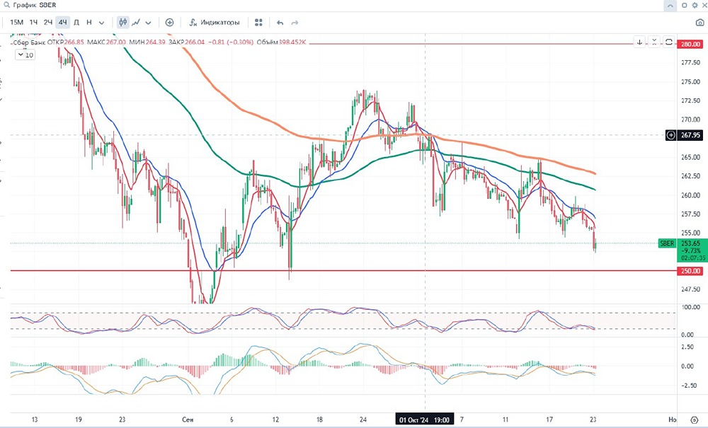 Добрый день уважаемые дамы и господа, инвесторы и трейдеры! 🚨ПАО «Сбербанк» — российский финансовый конгломерат, крупнейший банк в России, Центральной и Восточной Европе, один из ведущих международных финансовых институтов. Предоставляет широкий спектр банковских услуг. В рамках стратегии трансформации «Сбербанка» в технологическую компанию начинает расти доля небанковских услуг, таких как онлайн-магазины электронной торговли, телекомы, страхование, медицина и прочее. ⛔Позитив: 📍1. Планы Сбербанка провести эксперименты по листингу иностранных ЦФА 📍2. Обсуждение интеграции биоэквайринга Сбербанком и НСПК с другими банками 📍3. Запуск программы почасового страхования Сберстрахования 📍4. Сделка по покупке образовательных платформ Нетология и Фоксфорд может способствовать диверсификации деятельности Сбер ⛔Негатив: 📍1. Увеличение ипотечных ставок может негативно сказаться на спросе на ипотечные кредиты 📢Дополнительно: 🥇1. Чистая прибыль «Сбербанка» по РСБУ за 9 месяцев 2024 года составила ₽1,193 трлн, увеличившись на 5,7% по сравнению с прошлым годом. 🥈2. Чистый процентный доход вырос на 14,5% до ₽1,914 трлн. Комиссионный доход увеличился на 7% до ₽0,551 трлн. 🥉3. Сбербанк в сентябре получил 140,6 млрд руб. Чистой прибыли по РСБУ против 130,2 млрд руб. годом ранее 💵Дивиденды: Согласно дивидендной политике Сбербанк выплачивает 50% чистой прибыли по МСФО. Такие дивиденды будут поддерживаться при уровне достаточности капитала в 13.3%. Выплачивают равные дивиденды по обыкновенным акциям и по префам один раз в год. 💴 - $SBER : ФА Капитализация - 5833.0 млрд ₽ Кол-во акций ао– 21587.0 млн Кол-во акций ап– 1000.0 млн Р/Е - 3.5 P/S - 0.8 P/B - 0.0 ROE - 25.9% EV/EBITDA - 0.0 ⏰ - ТФ 1 DAY 🛠 ТА - скользящие, стохастик, объем, МАСD, уровни. 📈- тренд вниз ‼- Гистограмма MACD в отрицательных значениях, линии MACD находятся в отрицательных значениях. Стохастик приближается к зоне перепроданности. В преддверии КС вероятно боковое движение, но пока 244 это уровень поддержки. 11 июля цена пересекла сверху вниз 100 ЕМА и показывает нисходящую тенденцию. При закрытии дня выше 261,37 возможен разворот в лон. ⏰ -ТФ 4 часа 🛠 ТА - скользящие, стохастик, объем, МАСD, уровни. 📈- тренд вниз ‼ - Гистограмма MACD в отрицательных значениях, линии MACD находятся в отрицательных значениях. Стохастик находится у зоны перепроданности. При закрытии выше 256,94 возможен разворот в лонг. 📊За 6 (04.24-09.24) месяцев цена снизилась более чем на 10 % . Мин. Рrice = 240,01 Мах. Рrice = 330.45 📌 Цены смены тренда указаны в соответствии с ТФ и являются ориентировочными и со временем смещаются.📌 🃏Всем профита и до скорой встречи!🃏