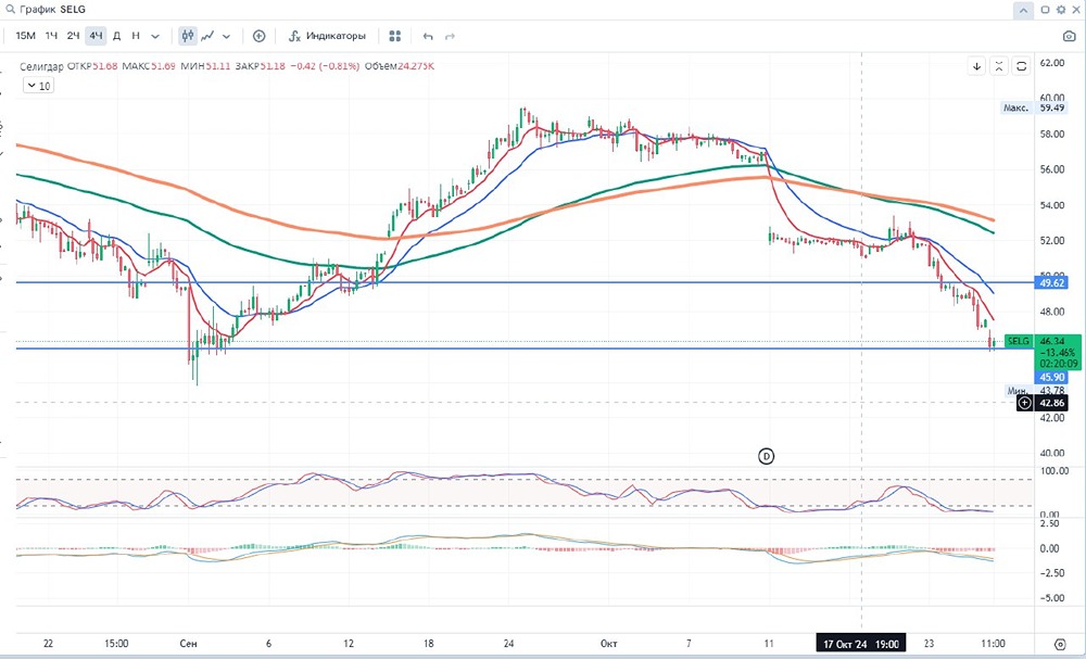 Добрый день уважаемые дамы и господа, инвесторы и трейдеры! 🚨ПАО «Селигдар» консолидирует акции золотодобывающих предприятий, осуществляющих деятельность в Республике Саха (Якутия), Республике Бурятия, Алтайском и Хабаровском краях, Оренбургской области. С 2013 года в структуру Холдинга входят также оловодобывающие активы в Хабаровском крае. Головной офис компании расположен в г. Алдане, Республика Саха (Якутия). Холдинг специализируется на разработке небольших и средних по запасам месторождений золота, преимущественно с невысокими содержаниями (1-2 г/т), отрабатываемых открытым способом и последующим извлечением полезного компонента методом кучного выщелачивания. Оловодобывающие активы Холдинга представлены месторождением Правоурмийское, на котором осуществляется добыча руды подземным способом, и двумя месторождениями бывшего Солнечного ГОКа – Фестивальным и Перевальным – на которых осуществляются работы по реконструкции и подготовка к возобновлению добычи руды и производству оловянного концентрата. ✅Позитив: 📍1. Один из заводов «Селигдара» досрочно выполнил годовой производственный план. 📍2. Власти планируют обязать заводы по очистке золота отслеживать происхождение и маршрут каждой партии поступающего сырья, что поможет обелить рынок. ⛔Негатив: 📍1. США включили компанию «Золото Селигдара» в санкционный список. 📍2. Госдума повысила цену отсечения для расчета вычета по НДПИ при добыче олова в ДФО. 📢Дополнительно: 🥇1. Производство золота холдингом «Селигдар» по итогам 9 месяцев 2024 года составило 5,937 тонн, снизившись на 5% по сравнению с 6,253 тонн годом ранее. 🥈2. Объём реализации золота вырос на 15%, до 5,672 тонн. Производство олова сократилось на 22%, до 1,751 тонн. Производство меди увеличилось на 65% до 1,435 тонн. 🥉3. Выручка от реализации золота выросла на 43% и составила ₽26,7 млрд. Цена реализации золота увеличилась на 25%. 💵Дивиденды: Согласно действующей дивидендной политике Селигдар будет стремиться направлять на выплату дивидендов не менее 30% прибыли по МСФО. При этом целевые значения выплат зависят от уровня долга компании (чистый долг/EBITDA). Если чистый долг/EBITDA < 1, то на дивиденды направляется 30% прибыли. Если чистый долг/EBITDA от 1 до 2, то - 20%. Если чистый долг/EBITDA от 2 до 3, то - 10%. Если чистый долг/EBITDA > 3, то дивиденды не выплачиваются. Стабильность дивидендов сложно прогнозируема. Возможно улучшение ситуации когда или если компания снизит долг ниже 2х по коэффициенту чистый долг/EBITDA. 💴 - $SELG : ФА Капитализация - 48.9 млрд ₽ Кол-во акций ао– 1030.0 млн Кол-во акций ап– 0.0 млн Р/Е - 17.2 P/S - 0.9 P/B - 2.2 ROE - 11.7% EV/EBITDA - 5.2 ⏰ - ТФ 1 DAY 🛠 ТА - скользящие, стохастик, объем, МАСD, уровни. 📈- тренд вниз ‼- Гистограмма MACD в отрицательных значениях, линии MACD находятся в отрицательных значениях. Стохастик находится в зоне перепроданности. 24 мая цена пересекла сверху вниз 100 ЕМА и показывает нисходящую тенденцию. Несмотря на рост котировок золота и ослабления рубля , бумаги пока не выберутся из своего пике. При закрытии дня выше 52,99 возможен разворот в лонг. ⏰ -ТФ 4 часа 🛠 ТА - скользящие, стохастик, объем, МАСD, уровни. 📈- тренд вниз ‼ - Гистограмма MACD в отрицательных значениях, линии MACD находятся в отрицательных значениях. Стохастик находится в зоне перепроданности. Если пойдут ниже, то отскок вероятен от 46, далее в случае роста, первая цель могла бы быть в 