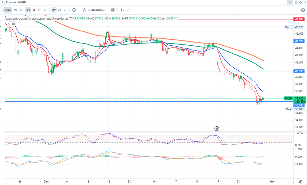 Добрый день уважаемые дамы и господа, инвесторы и трейдеры! 🚨 ПАО «Магнитогорский металлургический комбинат» входит в число крупнейших мировых производителей стали и занимает лидирующие позиции среди предприятий черной металлургии России. Активы компании в России представляют собой крупный металлургический комплекс с полным производственным циклом, начиная с подготовки железорудного сырья и заканчивая глубокой переработкой черных металлов. ММК производит широкий сортамент металлопродукции с преобладающей долей продукции с высокой добавленной стоимостью. ✅Позитив: 📍1. Низкая долговая нагрузка 📍2. Ожидаемая дивидендная доходность значительно выше рынка ⛔Негатив: 📍1. Планируемые капитальные ремонты в IV квартале 2024 года могут оказать существенное влияние на производственные возможности ММК. 📍2. Чистая прибыль ММК сократилась 📢Дополнительно: 🥇1. Чистая прибыль «Магнитогорского металлургического комбината» по МСФО за 9 месяцев 2024 года составила ₽67,81 млрд, что на 20,4% ниже по сравнению с ₽85,23 млрд в предыдущем году. 🥈2. Выручка увеличилась на 8,2% до ₽602,83 млрд против ₽557,37 млрд годом ранее. 🥉3. Выплавка чугуна сократилась на 2,2%, до 7,361 млн тонн. Производство угольного концентрата снизилось на 30% до 1,864 млн тонн, а объём производства железорудного сырья сократился на 5,4% и составил 1,645 млн тонн. 💵Дивиденды: Дивидендная политика (утв. ноябрь 2019 г.) ММК подразумевает выплату дивидендов в размере не менее 100% свободного денежного потока (FCF), если чистый долг/EBITDA менее 1.0х. В случае превышения коэффициентом значения 1.0х, сумма средств, направляемая на выплату дивидендов, будет составлять не менее 50% свободного денежного потока. Компания имеет низкую долговую нагрузку, сохраняя возможность наращивания дивидендных выплат. 💴 - $MAGN : ФА Капитализация - 428.6 млрд ₽ Кол-во акций ао– 11174.0 млн Кол-во акций ап– 0.0 млн Р/Е - 3.6 P/S - 0.6 P/B - 0.7 ROE - 17.2% EV/EBITDA - 1.7 ⏰ - ТФ 1 DAY 🛠 ТА - скользящие, стохастик, объем, МАСD, уровни. 📈- тренд вниз ‼- Гистограмма MACD в отрицательных значениях, линии MACD находятся в отрицательных значениях. Стохастик находится в зоне перепроданности. Очень вероятно, что нарисовали отскок от 36,6, если сегодня н закроется день ниже данной отметки, то есть вероятность похода до 40,8. 10 июня цена пересекла сверху вниз 100 ЕМА и показывает нисходящую тенденцию. При закрытии дня выше 41,399 возможен разворот в лонг. ⏰ -ТФ 4 часа 🛠 ТА - скользящие, стохастик, объем, МАСD, уровни. 📈- тренд вниз ‼ - Гистограмма MACD в положительных значениях, линии MACD находятся в отрицательных значениях. Стохастик пытается выйти из зоны перепроданности. Пока такое поведение может говорить о начале отскока и движения вверх. При закрытии выше 37,923 возможен разворот в лонг. 📊За 6 (05.24-10.24) месяцев цена снизилась более чем на 30 % . Мин. Рrice = 36,08 Мах. Рrice = 59.94 📌 Цены смены тренда указаны в соответствии с ТФ и являются ориентировочными и со временем смещаются.📌 🃏Всем профита и до скорой встречи!🃏