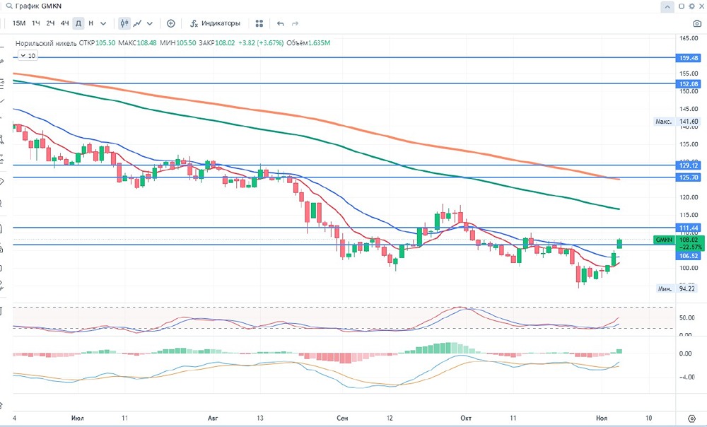Добрый день уважаемые дамы и господа, инвесторы и трейдеры! 🚨ПАО «Норникель» — российская горно-металлургическая компания. В настоящее время «Норникель» объединяет группу предприятий, возглавляемую Публичным акционерным обществом "Горно-металлургическая компания «Норильский никель». «Норникель» является лидером горно-металлургической промышленности России, а также крупнейшим производителем палладия и рафинированного никеля и одним из крупнейших производителей платины и меди. «Норникель» производит также кобальт, родий, серебро, золото, иридий, рутений, селен, теллур и серу. Основными видами деятельности группы являются поиск, разведка, добыча, обогащение и переработка полезных ископаемых, производство, маркетинг и реализация цветных и драгоценных металлов. География поставок продукции охватывает свыше трех десятков стран. ✅Позитив: 📍1. Увеличение прогноза производства никеля, палладия и платины 📍2. Планы правительства уменьшить налогообложение для компаний, производящих важнейшие металлы для высокотехнологичных отраслей 📍3. Рентабельность капитала выше рынка ⛔Негатив: 📍1. Введение санкций США против импорта российских металлов, включая палладий 📍2. Снижение чистой прибыли компании по итогам 9 месяцев 2024 года 📢Дополнительно: 🥇1. Объём производства никеля компанией «Норильский никель» за 9 месяцев 2024 года вырос на 0,3% до 146,2 тыс. тонн. Объём производства меди увеличился на 7% и составил 326,07 тыс. тонн. 🥈2. Выпуск палладия вырос на 1%, составив 2,2 млн унций. Объём производства платины сократился на 1%, до 521 тыс. унций. Компания повысила прогноз производства металлов в 2024 году, до 196-204 тыс. тонн никеля, 337-357 тыс. тонн меди, 2,6-2 ,7 млн унций палладия и 639-664 тыс. унций платины. 🥉3. Чистая прибыль ГМК «Норильский никель» по РСБУ за 9 месяцев 2024 года составила ₽37,85 млрд, что на 44,4% ниже по сравнению с ₽68,09 млрд в предыдущем году. Выручка увеличилась на 3,6% до ₽644,42 млрд против ₽622,02 млрд годом ранее. 💵Дивиденды: Действующая ранее дивидендная политика Норильского никеля с привязкой к EBITDA по соглашению с РУСАЛом прекратила свое действие 1 января 2023 года. Ожидаем новую дивидендную политику, которая скорее всего будет привязана к денежному потоку. Из-за ожиданий широкой инвест.программы норма выплат сократится. 💴 - $GMKN : ФА Капитализация - 1515.0 млрд ₽ Кол-во акций ао– 15286.0 млн Кол-во акций ап– 0.0 млн Р/Е - 6.49 P/S - 1.3 P/B - 2.7 ROE - 30.0% EV/EBITDA - 3.7 ⏰ - ТФ 1 DAY 🛠 ТА - скользящие, стохастик, объем, МАСD, уровни. 📈- тренд вверх ‼- Гистограмма MACD в положительных значениях, линии MACD находятся в отрицательных значениях. Стохастик отбился от зоны перепроданности и показывает тенденцию к росту. 23 апреля цена пересекла сверху вниз 100 ЕМА и показывает нисходящую тенденцию. При закрытии дня ниже 100,3 возможен разворот в шорт. Пока вероятно небольшое движение цены на север, а потом частичное ослабление движения и закрепление в районе 102,5-107,0. ⏰ -ТФ 4 часа 🛠 ТА - скользящие, стохастик, объем, МАСD, уровни. 📈- тренд вверх ‼ - Гистограмма MACD в положительных значениях, линии MACD находятся в положительных значениях. Стохастик находится в зоне перекупленности. При закрытии ниже 100,56 возможен разворот в шорт 📊За 6 (05.24-10.24) месяцев цена снизилась более чем на 35 % . Мин. Рrice = 94,22 Мах. Рrice = 159.44 📌 Цены смены тренда указаны в соответствии с ТФ и являются ориентировочными и со временем сме