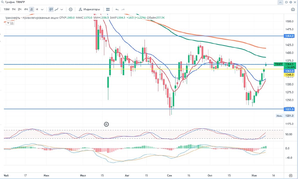 Добрый день уважаемые дамы и господа, инвесторы и трейдеры! 🚨 Публичное акционерное общество «Транснефть» — российская нефтепроводная компания, контролируемая государством. Оператор магистральных нефтепроводов и нефтепродуктопроводов. Штаб-квартира расположена в Москве. «Транснефть» — крупнейшая в мире нефтепроводная компания, владеет 68 тысяч км магистральных трубопроводов, более 500 перекачивающими станциями, более 24 млн кубометров резервуарных ёмкостей. Компания транспортирует 83% добываемой в России нефти и 30% произведённых в России нефтепродуктов. Протяжённость магистральных нефтепроводов ПАО «Транснефть» составляет 50,8 тысяч км, нефтепродуктопроводов - 16,4 тысяч км. ✅Позитив: 📍1. Ожидаемая дивидендная доходность выше рынка 📍2. Предложение ФАС повысить тарифы Транснефти на прокачку нефти в 2025 г 📍3. Платит высокие дивиденды 📍4. Сформирована денежная позиция объемом 230 млрд. руб. ⛔Негатив: 📍1. Сокращение чистой прибыли Транснефти 📍2. Возможное сокращение добычи нефти 📢Дополнительно: 🥇1. Чистая прибыль «Транснефти» по РСБУ за 9 месяцев 2024 года составила ₽96,99 млрд, снизившись в 2 раза по сравнению с ₽190,55 млрд в предыдущем году. 🥈2. Выручка увеличилась на 6,7% до ₽943,23 млрд против ₽884,03 млрд годом ранее. 🥉3. Возможные дивиденды могут составить 15% доходности, а именно 189 руб/акция. 💵Дивиденды: По дивидендной политике Транснефти предполагается выплачивать в качестве дивидендов не менее 25% чистой прибыли по МСФО (но как госкомпания выплачивает 50% от чистой прибыли по МСФО). Обыкновенные акции полностью принадлежат государству, Размер дивиденда, выплачиваемый на одну привилегированную акцию, не может быть меньше размера дивиденда, выплачиваемого на одну обыкновенную акцию. 💴 - $TRNFP : ФА Капитализация - 198.4 млрд ₽ Кол-во акций ао– 569.4 млн Кол-во акций ап– 155.5 млн Р/Е - 0.68 P/S - 0.14 P/B - 0.4 ROE - 10.7% EV/EBITDA - 1.4 ⏰ - ТФ 1 DAY 🛠 ТА - скользящие, стохастик, объем, МАСD, уровни. 📈- тренд вверх ‼- Гистограмма MACD в положительных значениях, линии MACD находятся в отрицательных значениях, но показывают растущую тенденцию. Стохастик приближается к средней линии. 04 июля цена пересекла сверху вниз 100 ЕМА и показывает нисходящую тенденцию. При закрытии дня ниже 1301,3 возможен разворот в шорт. Вероятно, что закрепившись выше 1348 цена пойдет выше до 1386.3. ⏰ -ТФ 4 часа 🛠 ТА - скользящие, стохастик, объем, МАСD, уровни. 📈- тренд вверх ‼ - Гистограмма MACD в положительных значениях, линии MACD находятся в положительных значениях. Стохастик находится в зоне перекупленности. При закрытии ниже 1313,4 возможен разворот в шорт. 📊За 6 (04.24-09.24) месяцев цена снизилась более чем на 22 % . Мин. Рrice = 1201,00 Мах. Рrice = 1704.00 📌 Цены смены тренда указаны в соответствии с ТФ и являются ориентировочными и со временем смещаются.📌 🃏Всем профита и до скорой встречи!🃏