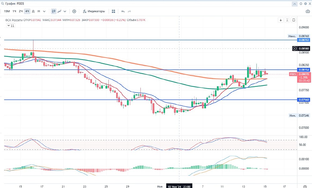 Добрый день уважаемые дамы и господа, инвесторы и трейдеры! 🚨«Федеральная сетевая компания — Россети» (ПАО «Россети») — российская энергетическая компания, основным видом деятельности которой является передача электроэнергии по Единой национальной электрической сети (ЕНЭС) России. В этом виде деятельности компания является субъектом естественной монополии. Объекты электросетевого хозяйства компании расположены в 78 регионах. В зоне ответственности ФСК находятся 149 тыс. км высоковольтных магистральных линий электропередачи и 889 подстанции общей мощностью более 352 гигаватта. ✅Позитив: 📍1. Группа «Россети» планирует инвестировать в магистральный комплекс Дальнего Востока более ₽600 млрд в 2024-2029 годах. Большая часть средств будет направлена на электроснабжение Восточного полигона. ⛔Негатив: 📍1. Переоценка стоимости находящихся на балансе Россети акций дочерних обществ привела к сокращению прибыли компании в 191 раз. 📍2. Выплат дивидендов по итогам 2022–2026 годов не ожидается. 📍3. Из-за высокой КС в 2024г. резко вырастут процентные расходы 📢Дополнительно: 🥇1. Чистая прибыль «Федеральной сетевой компании – Россети» по РСБУ за 9 месяцев 2024 года составила ₽2,39 млрд, многократно снизившись по сравнению с ₽458,8 млрд в предыдущем году. 🥈2. Выручка увеличилась на 10,7% до ₽260,15 млрд против ₽235,09 млрд годом ранее. 🥉3. По операционным показателям рост, снижение чистой прибыли произошел из-за переоценки стоимости дочек. 💵Дивиденды: Дивидендная политика компании Федеральная сетевая компания - Россети (как и других МРСК) предусматривает выплаты в 50% чистой прибыли, определенной как максимум из отчетностей РСБУ или МСФО. При этом такая чистая прибыль корректируется на обязательные отчисления, инвестиции из чистой прибыли, погашение убытков прошлых лет. Выплат дивидендов по итогам 2022–2026 годов не ожидается, компания имеет крупную инвестпрограмму. 💴 - $FEES : ФА Капитализация - 165.0 млрд ₽ Кол-во акций ао– 2 113 460.0 млн Кол-во акций ап– 0.0 млн Р/Е - 1.0 P/S - 0.1 P/B - 0.1 ROE - 9.2% EV/EBITDA - 1.0 ⏰ - ТФ 1 DAY 🛠 ТА - скользящие, стохастик, объем, МАСD, уровни. 📈- тренд вниз ‼- Гистограмма MACD в положительных значениях, линии MACD находятся в отрицательных значениях, но показывают тенденцию к росту. Стохастик находится у средней линии. 20 мая цена пересекла сверху вниз 100 ЕМА и показывает нисходящую тенденцию. При закрытии дня ниже 0,07836 возможен разворот в шорт. Цена подходит к одному из уровней в 0,08154. При закрытии ниже 0,07818 возможен поход ниже до 0,0756-0,0765. ⏰ -ТФ 4 часа 🛠 ТА - скользящие, стохастик, объем, МАСD, уровни. 📈- тренд вниз ‼ - Гистограмма MACD в отрицательных значениях, линии MACD находятся в положительных значениях. Стохастик вышел из зоны перепроданности. При закрытии ниже 0,07979 возможен разворот в шорт. 📊За 6 (04.24-09.24) месяцев цена снизилась более чем на 40 % . Мин. Рrice = 0,07246 Мах. Рrice = 0.13282 📌 Цены смены тренда указаны в соответствии с ТФ и являются ориентировочными и со временем смещаются.📌 🃏Всем профита и до скорой встречи!🃏