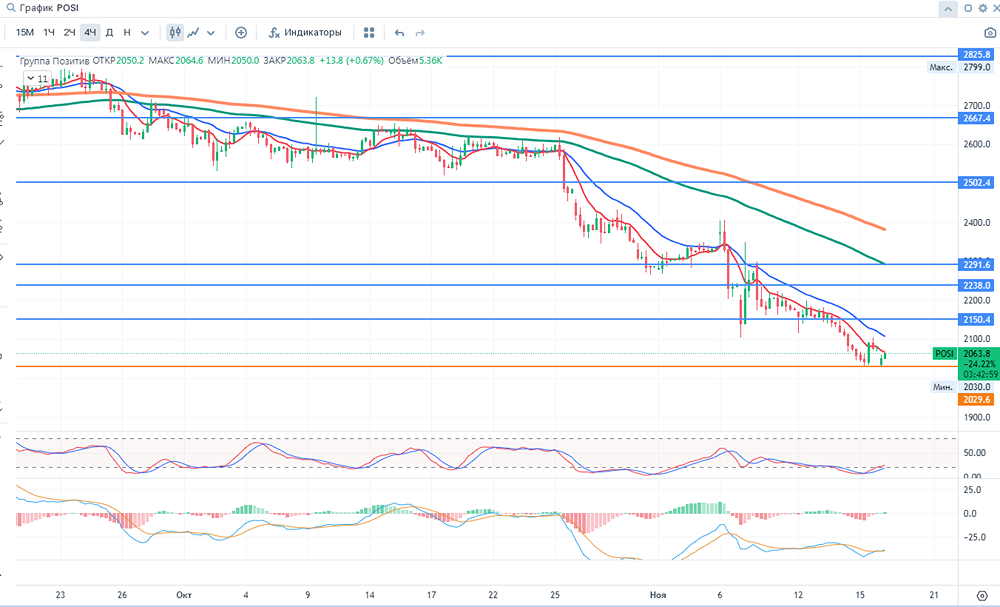 Добрый день уважаемые дамы и господа, инвесторы и трейдеры! 🚨ПАО Группа Позитив ( Positive Technologies) -российский разработчик решений в области кибербезопасности. Positive Technologies уже почти 20 лет создает инновационные решения в сфере информационной безопасности. Продукты и сервисы компании позволяют выявлять, верифицировать и нейтрализовать реальные бизнес-риски, которые могут возникать в IT-инфраструктуре предприятий. Технологии Positive Technologies построены на многолетнем исследовательском опыте и экспертизе ведущих специалистов по кибербезопасности. ✅Позитив: 📍1. Менеджмент компании ожидает, что объем отгрузок за 2024 год составит от 30 до 36 млрд рублей 📍2. Российский рынок информационной безопасности ожидается вырастет почти в три раза к 2028 году 📍3. Сектор кибербезопасности растет хорошими темпами. Результаты компании опережают рынок ⛔Негатив: 📍1. Доходность акции за последний год ниже чем средняя по сектору 📢Дополнительно: 🥇1.Убыток Positive Technologies по МСФО за 9 месяцев 2024 года составил ₽5,27 млрд против прибыли ₽0,15 млрд в предыдущем году. 🥈2. Выручка увеличилась на 16,3% до ₽9,72 млрд против ₽8,36 млрд годом ранее. 🥉3. Объем отгрузок Positive Technologies за 9 месяцев 2024 года составил ₽9,1 млрд, увеличившись на 2% по сравнению с ₽8,9 млрд годом ранее. Менеджмент ожидает, что итоговый объем отгрузок за 2024 год составит от ₽30-36 млрд, что ниже изначальных ожиданий компании. 💵Дивиденды: Согласно новой дивидендной политике Группы Позитив на выплату дивидендов будет направляться от 50% до 100% управленческой чистой прибыли (NIC). При определении доли NIC Совет директоров будет принимать во внимание поддержание оптимального значения показателя Чистый долг/EBITDA LTM, но в любом случае данный показатель не должен превышать 2,5. 💴 - $POSI : ФА Капитализация - 132.3 млрд ₽ Кол-во акций ао– 66.0 млн Кол-во акций ап– 0.0 млн Р/Е - 30.2 P/S - 7.5 P/B - 24.2 ROE - 73.5% EV/EBITDA - 24.6 ⏰ - ТФ 1 DAY 🛠 ТА - скользящие, стохастик, объем, МАСD, уровни. 📈- тренд вниз ‼- Гистограмма MACD в отрицательных значениях, линии MACD находятся в отрицательных значениях. Стохастик находится в зоне перепроданности.15 августа цена пересекла сверху вниз 100 ЕМА и показывает нисходящую тенденцию. При закрытии дня выше 2296,4 возможен разворот в лонг. В случае закрепления выше 2029 возможна смена тренда и поход до 2500. ⏰ -ТФ 4 часа 🛠 ТА - скользящие, стохастик, объем, МАСD, уровни. 📈- тренд вниз ‼ - Гистограмма MACD вышла в положительные значения, линии MACD находятся в отрицательных значениях. Стохастик находится в зоне перепроданности, но пытается из неё выйти. При закрытии выше 2107.3 возможен разворот в лонг. 📊За 6 (05.24-10.24) месяцев цена снизилась более чем на 24 % . Мин. Рrice = 2224,6 Мах. Рrice = 3200.00 📌 Цены смены тренда указаны в соответствии с ТФ и являются ориентировочными и со временем смещаются.📌 🃏Всем профита и до скорой встречи!🃏