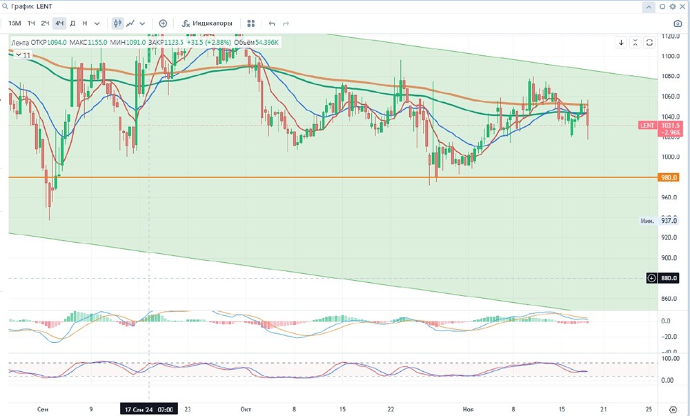 Добрый день уважаемые дамы и господа, инвесторы и трейдеры! 🚨МКПАО «Лента» – ведущий многоформатный продуктовый и FMCG ритейлер в России. Компания развивает форматы гипермаркетов, супермаркетов, а также недавно запустила новый формат магазинов у дома под брендом «Мини Лента». «Лента» также дает покупателям возможность совершать покупки онлайн, используя свои сервисы «Лента Онлайн», сервисы онлайн-партнеров и платформы «Утконос». По состоянию на 30 сентября 2022 года управляла 254 гипермаркетами и 557 супермаркетами, а также магазинами «Лента Мини» в более чем 200 городах России с торговой площадью почти 1,78 млн квадратных метров. Средняя торговая площадь гипермаркета «Лента» составляет примерно 5 500 квадратных метров, средняя площадь супермаркета «Лента» — 800 квадратных метров. а формат «Мини-Лента» в среднем составляет 500 метров. Компания управляет 14 распределительными центрами для снабжения всех своих магазинов. ✅Позитив: 📍1. Экспансия сети магазинов малого формата «Монетка» 📍2. Чистый долг/EBITDA ритейлера Лента снизился до 1,4х к концу сентября 2024 года по сравнению с 2,8х на конец 2023 года. 📍3. Компания хочет удвоить выручку 2020 года к 2025 году до 1 трлн рублей ⛔Негатив: 📍1. Не выплачивает дивиденды. 📍2. Суд обратил убыток от пожара в томской "Ленте" в 1,2 млрд руб. на подрядчиков гипермаркета 📢Дополнительно: 🥇1. Розничная выручка «Ленты» за 9 месяцев 2024 года составила ₽618,9 млрд, увеличившись на 60,9%. Онлайн-продажи выросли на 27,4% до ₽45,3 млрд. 🥈2. LFL - продажи увеличились на 13,9%, трафик — на 4,6%, а средний чек — на 8,9%. Общая торговая площадь увеличилась на 39,8% и составила 2 379,1 тыс. кв. м. 🥉3. Чистая прибыль «Ленты» по МСФО за 9 месяцев 2024 года составила ₽14,4 млрд против убытка ₽2,8 млрд в предыдущем году. Выручка увеличилась на 58,9% до ₽624,6 млрд против ₽393,1 млрд годом ранее. 💵Дивиденды: Согласно дивидендной политике (ноябрь 2021 г.) Лента планирует направлять на выплаты акционерам не более 100% свободного денежного потока (FCF) за соответствующий период при условии, что коэффициент NetDebt/EBITDA не превысит 1,5х. Если NetDebt/EBITDA меньше 1,0х, компания может направить на дивиденды более 100% FCF. Если NetDebt/EBITDA будет больше 1,5х, на выплаты будет направлено не более 50% FCF в качестве дивидендов. Компания не выплачивает дивиденды по инфраструктурным вопросам. 💴 - $LENT : ФА Капитализация - 121.0 млрд ₽ Кол-во акций ао– 116.0 млн Кол-во акций ап– 0.0 млн Р/Е - 9.1 P/S - 0.2 P/B - 1.0 ROE - 9.5% EV/EBITDA - 5.16 ⏰ - ТФ 1 DAY 🛠 ТА - скользящие, стохастик, объем, МАСD, уровни. 📈- тренд вниз ‼- Гистограмма MACD в положительных значениях, линии MACD находятся в отрицательных значениях, но стремятся пересечь среднюю линию. Стохастик находясь выше средней линии, но снижаются. 14 ноября цена пересекла сверху вниз 100 ЕМА и показывает нисходящую тенденцию. При закрытии дня выше 1041 возможен разворот в лонг. По сути сейчас затяжной широкий боковик 995-1263. При закреплении выше 1075 возможен поход к 1100-1165 ⏰ -ТФ 4 часа 🛠 ТА - скользящие, стохастик, объем, МАСD, уровни. 📈- тренд вниз ‼ - Гистограмма MACD в отрицательных значениях, линии MACD находятся в положительных значениях. Стохастик находится ниже средней линии. При закрытии выше 1043.3 возможен разворот в лонг. 📊За 6 (04.24-09.24) месяцев цена снизилась более чем на 10% . Мин. Рrice = 937.0 Мах. Рrice = 1288.0 📌 Цены смены тренда указаны в соответствии с ТФ и являются ориентировочными и со временем смещаются.📌 🃏Всем