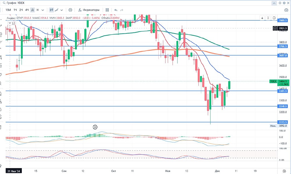 Добрый день уважаемые дамы и господа, инвесторы и трейдеры! Пост написан по просьбе слушателя эфира. «Яндекс» — российская транснациональная компания в отрасли информационных технологий, владеющая одноимённой системой поиска в интернете, интернет-порталом и веб-службами в нескольких странах. Наиболее заметное положение занимает на рынках России, Белоруссии и Казахстана. Позитив: 1. Развитие беспилотного транспорта и возможная поддержка со стороны государства 2. Постоянные инвестиции в привлечение водителей, это плюс для услуг Яндекс такси. 3. Приобретение технологической платформы Pruffme Негатив: 1. Акции протеста водителей такси против высокой комиссии 2. Проверки властей Киргизии по поводу налогов и антимонопольных предписаний Дополнительно: 1. Убыток «Яндекса» по МСФО за 9 месяцев 2024 года составил ₽4,1 млрд против прибыли ₽54,9 млрд в предыдущем году. 2. Выручка увеличилась на 37,4% до ₽754,4 млрд против ₽549,2 млрд годом ранее. 3. Компания нарастила долг на ₽49 млрд до 194 млрд, а денежная позиция выросла на ₽24 млрд до ₽127 млрд. Дивиденды: Яндекс не имеет утвержденной дивидендной политики, так как является компанией роста и дивиденды в планы компании не входят. Можно ожидать дивиденды, когда или если рост компании замедлится. 💴 - $YDEX : ФА Капитализация - 918.9 млрд ₽ Кол-во акций ао– 361.5 млн Кол-во акций ап– 0.0 млн Р/Е - 33.5 P/S - 1.15 P/BV - 7.35 ROE - 9.2% EV/EBITDA - 9.94 DSI 0.14 ⏰ - ТФ 1 DAY 🛠 ТА - скользящие, стохастик, объем, МАСD, уровни. 📈- тренд вниз ‼- Гистограмма MACD в положительных значениях, линии MACD находятся в отрицательных значениях. Стохастик находится ниже средней линии. 25 октября цена пересекла сверху вниз 100 ЕМА и показывает нисходящую тенденцию. При закрытии дня выше 3505 возможен разворот в лонг. Далее же, при неизменности тенденции отметка 3640. В течении прошлых недель шли заливы в шорт, после чего на графике нарисовали двойное дно, которое вполне могут благоприятно отыграть. ⏰ -ТФ 4 часа 🛠 ТА - скользящие, стохастик, объем, МАСD, уровни. 📈- тренд вверх ‼ - Гистограмма MACD в положительных значениях, линии MACD находятся в положительных значениях. Стохастик пытается войти в зону перекупленности. 22 октября цена пересекла сверху вниз 100 ЕМА и показывает нисходящую тенденцию. При закрытии ниже 3368,9 возможен разворот в шорт. При закреплении выше 3470 возможно продолжение движения вверх. За 6 (06.24-11.24) месяцев цена снизилась более чем на 17 % . Мин. Рrice = 3092.0 Мах. Рrice = 4542.0 📌 Цены смены тренда указаны в соответствии с ТФ и являются ориентировочными и со временем смещаются.📌 Мои каналы: БКС https://s.bcs.ru/hua6D Телега https://t.me/ua1cec_trading Дзен https://dzen.ru/ua1cec_trade?share_to=link 🃏Всем профита и до скорой встречи!🃏