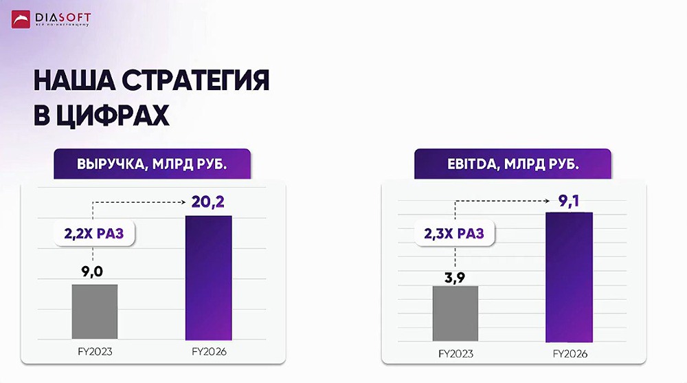 День Диасофта «Не знаю, как эта сеть дельфинариев делает такие деньги» (с) 👨💻 Ладно, не дельфинарии. ИТ-компания, поставляющая софт для банковского сектора. 95% выручки приходит именно отсюда, но компания хочет развивать смежные направления и к 2026 году увеличить их долю в выручке до 30%. Ожидается, что в этом году направления финансовые рынки увеличатся на 30%, страхование и НПФ – на 57%, новые платежные системы удвоятся. Т.е. софт уже есть и он уже внедряется. Законтрактованная выручка Диасофта за 3кв 2024г выросла на 21% г/г до 20,4 млрд руб. Это значит, что контракты уже подписаны, осталось их только выполнить. Для этого был увеличен штат специалистов на 28%. 📊 План по самой выручке заключается в ее росте 30% ежегодно до 20.2 млрд в 2026 году со схожим темпом роста Ebitda до 9,1 млрд. Отдельно радует, что 65% выручки/ 70% Ebitda приходит от сервисов – тот самый повторяющийся (почти гарантированный) доход. Это дает уверенность в завтрашнем дне, делая компанию некой кэш-машинкой. Сам же Диасофт это понимает и 80% Ebitda отправляет на дивиденды. 🎯 Компания подтвердила таргет на текущий финансовый год (до марта 2025). В рамках цели – увеличение выручки на 30% до 11.8 млрд с рентабельностью 40% по Ebitda. Если они достигнут этих целей, то: ☑️ По итогам этого финансового года коэффициенты будут Р/Е = 9, Р/S = 3,3, Ev/Ebitda 7,6. ☑️ На конец 2025 года мультипликаторы уже выйдут Р/Е = 6,7, Р/S = 2,5, Ev/Ebitda 5,7. ☑️ За 2024 год будут выплачены дивиденды в сумме 377 рублей, 45 рублей из которых уже выплачены и 45 уйдут в отсечку 22 января. Дивдоходность 10.1%, что достаточно много для теха. ☑️ При выполнении среднесрочного плана, за 2026 год можно ждать уже 694 рубля с ДД 18.6%. Терпение явно вознаградится. 🗣 Также был ряд заявлений: 1️⃣ Байбек не будут делать – котировки поддержат выполнением стратегии. Предпочитают делать бизнес, а не спекулировать на рынке. Все-таки только что привлекли деньги с рынка. 2️⃣ СПО будет, но не раньше осени 2025 года. Дешево продавать не видят смысла - должны изменится общерыночные условия, снизиться ставка, вернутся справедливые оценки компаний. В целом идея на карандаше, но перспективы исполнения далекие. Не торопятся. 🤝 По итогу компанию вижу на уровне 4800, что на 29% выше текущих значений. Это несколько ниже, чем моя оценка с размещения, но и макроусловия изменились. Разумеется, при смягчении ДКП котировка цели будет ползти вверх. Кого держите из ИТ у себя в портфеле? Пишите в комментариях 👇 #DIAS