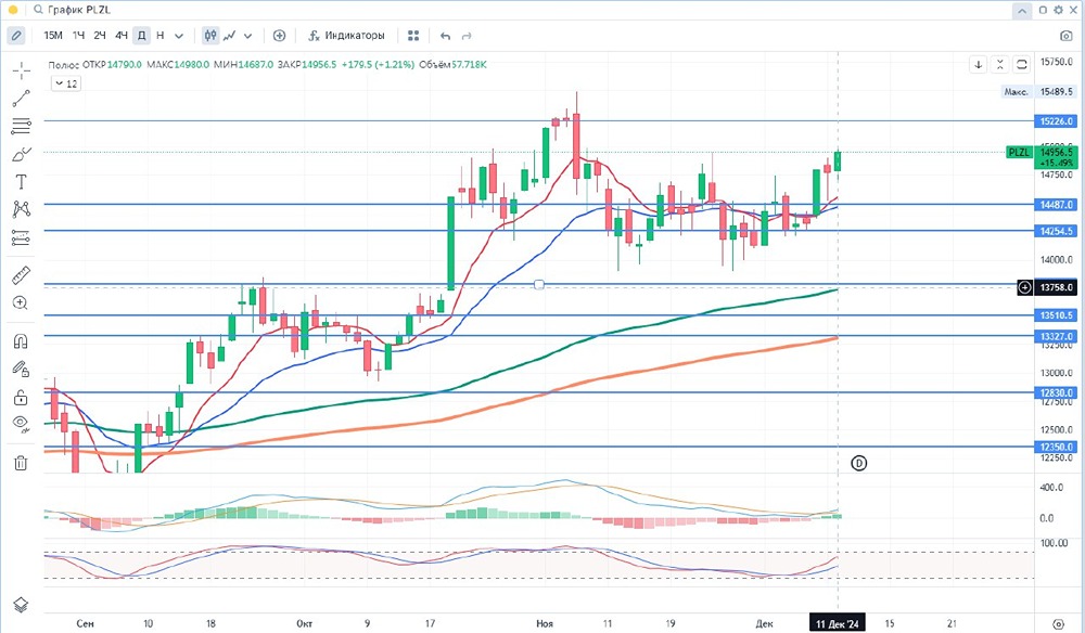 Добрый день уважаемые дамы и господа, инвесторы и трейдеры! «Полюс» — крупнейшая в России и одна из пяти ведущих мировых золотодобывающих компаний с одной из самых низких себестоимостью производства. Доказанные и вероятные запасы (P&P) оставляют 104 млн унций. Основана в 2006 году в ходе выделения золотодобывающих активов ОАО «ГМК Норильский никель». Основные предприятия компании расположены в Красноярском крае, Иркутской и Магаданской областях, а также в Республике Саха (Якутия) и включают 5 действующих рудников, золотоносные россыпи и ряд проектов в стадии строительства и развития. Позитив: 1. Положительные финансовые результаты компании ( значительный рост выручки и чистой прибыли) 2. Планы компании вернуться к выплате дивидендов (12.12.2024) 3. Представление обновленного технико-экономического обоснования проекта Сухой Лог в IV квартале 2024 года 4. Запуск Сухого Лога. Первая линия 2028, вторая линия 2029. Негатив: 1. Крупных месторождений открывается все меньше, содержание золота уменьшается. 2. Полюс подал иск на 10 млн рублей к российской 'дочке' Marubeni. Дополнительно: 1. Чистая прибыль «Полюса» по МСФО за 6 месяцев 2024 года составила ₽143,15 млрд, увеличившись в 3,4 раза по сравнению с ₽42,38 млрд в предыдущем году. Выручка выросла на 34,8% до ₽248,16 млрд против ₽184,13 млрд годом ранее. 2. Объём производства золота компанией «Полюс» за 6 месяцев 2024 года составил 1,473 млн унций, увеличившись на 3% по сравнению с предыдущим годом. Продажи золота выросли на 1%, до 1,263 млн унций. 3. Золотодобытчик понизил прогноз общих денежных затрат на текущий год. Теперь компания оценивает ТСС в диапазоне $425–$475 на унцию против прежних $450–$500 на унцию. Прогноз капзатрат в размере $1 550–$1 700 млн остается без изменений. Дивиденды: Дивидендная политика Полюса подразумевает дивиденды каждые полгода по 30% от EBITDA, если отношение чистого долга к EBITDA будет меньше 2.5х (сейчас 0.8х). Если коэффициент превышает 2.5х, Совет директоров может принять решение о выплате дивидендов с учетом денежной позиции Общества, свободного денежного потока, прогноза на следующие периоды и рыночной конъюнктуры. Выплата дивидендов были отложены из-за сложной геополитической ситуации. 💴 - $PLZL : ФА Капитализация - 1417.0 млрд ₽ Кол-во акций ао– 133.6 млн Кол-во акций ап– 0.0 млн Р/Е - 9.36 P/S - 3.02 P/BV - (-20.9) ROE - 0.0% EV/EBITDA - 6.06 DSI 0.14 ⏰ - ТФ 1 DAY 🛠 ТА - скользящие, стохастик, объем, МАСD, уровни. 📈- тренд вверх ‼- Гистограмма MACD в положительных значениях, линии MACD находятся в положительных значениях. Стохастик выходит за среднюю линии и растет. 9 сентября цена пересекла снизу вверх 100ема и показывает восходящую тенденцию. При закрытии дня ниже 14467.5 возможен разворот в шорт. Закрытия ниже 14254, а уж тем более ниже 14005 не желательны ⏰ -ТФ 4 часа 🛠 ТА - скользящие, стохастик, объем, МАСD, уровни. 📈- тренд вверх ‼ - Гистограмма MACD в положительных значениях, линии MACD находятся в положительных значениях и растут. Стохастик вошел в зону перекупленности. При закрытии ниже 14622.4 возможен разворот в шорт. Возможный сценарий это попытка пробоя 15000 с дальнейшим откатом до 14750. Опять же скоро заседание ЦБ и прочие негативные факторы не кто не отменял... За 6 (06.24-11.24) месяцев цена выросла более чем на 16% . Мин. Рrice = 11100.0 Мах. Рrice = 15489.5 📌 Цены смены тренда указаны в соответствии с ТФ и являются ориентировочными и со временем смещаются.📌 Мои каналы: БКС https://s.bcs.ru/hua6D Телега https: