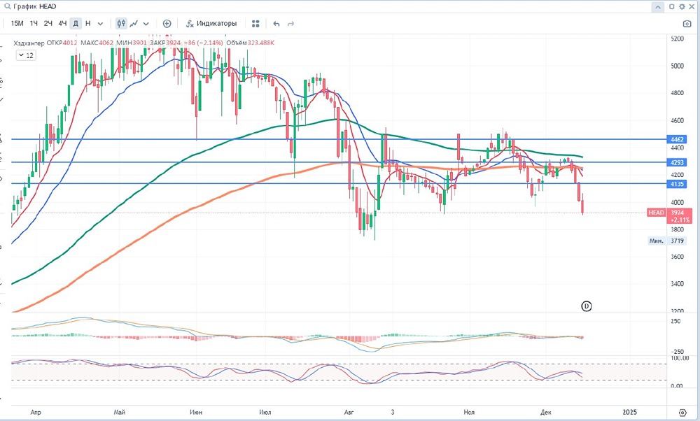 Добрый день уважаемые дамы и господа, инвесторы и трейдеры! HeadHunter Group PLC - это онлайн-рекрутинговая платформа в России и странах Содружества Независимых Государств, ориентированная на взаимодействие соискателей с работодателями. Компания предлагает работодателям и рекрутерам платный доступ к своей базе резюме и платформе объявлений о вакансиях. Он также предоставляет соискателям и работодателям портфель услуг. Компания взаимодействует с соискателями и работодателями через свои собственные настольные сайты, мобильные сайты и мобильные приложения. Позитив: 1. Уровень задолженности уменьшился за 5 лет 2. Благоприятное для компании время, т.к. наблюдается самый сильный дефицит рабочей силы, 3. Выручка растет высокими темпами Негатив: 1. Существенных негативных факторов не выявленно Дополнительно: 1. За 9м2024 выручка выросла на 39,3% г/г и достигла 29,2 млрд. руб. 2. Чистая прибыль выросла на 79,7% г/г и достигнула 16,9 млрд. руб. 3. Кубышка достигла 36,2 млрд. руб. Дивиденды: Дивидендная политика Хэдхантер подразумевает выплаты дивидендов не реже одного раза в год исходя из суммы не менее 60% и не более 100% от скорректированной чистой прибыли по МСФО, если отношение чистого долга к скорректированной EBITDA за последние 12 месяцев менее 2.5х. Если коэффициент превышает 2.5х, Совет директоров может принять решение о выплате дивидендов с учетом денежной позиции Общества, свободного денежного потока, прогноза на следующие периоды и рыночной конъюнктуры. 💴 - $HEAD : ФА Капитализация - 149.4 млрд ₽ Кол-во акций ао– 50.6 млн Кол-во акций ап– 0.0 млн Р/Е - 12.0 P/S - 5.07 P/BV - 20.1 ROE - 64.3% EV/EBITDA - 7.48 DSI 0.29 ⏰ - ТФ 1 DAY 🛠 ТА - скользящие, стохастик, объем, МАСD, уровни. 📈- тренд вниз ‼- Гистограмма MACD в отрицательных значениях, линии MACD находятся в отрицательных значениях. Стохастик приближается к зоне перепроданности. 19 ноября цена пересекла сверху вниз 100 ЕМА и показывает нисходящую тенденцию. При закрытии дня выше 4248 возможен разворот в лонг. При закрытии ниже 3927 возможен поход до 3600. ⏰ -ТФ 4 часа 🛠 ТА - скользящие, стохастик, объем, МАСD, уровни. 📈- тренд вниз ‼ - Гистограмма MACD в отрицательных значениях, линии MACD находятся в отрицательных значениях. Стохастик находится у зоны перепроданности. При закрытии выше 4202 возможен разворот в лонг. За 6 (06.24-11.24) месяцев цена снизилась более чем на 12 % . Мин. Рrice = 3719,0 Мах. Рrice = 4330.0 📌 Цены смены тренда указаны в соответствии с ТФ и являются ориентировочными и со временем смещаются.📌 🃏Всем профита и до скорой встречи!🃏 Мои каналы: БКС https://s.bcs.ru/hua6D Телега https://t.me/ua1cec_trading Дзен https://dzen.ru/ua1cec_trade?share_to=link