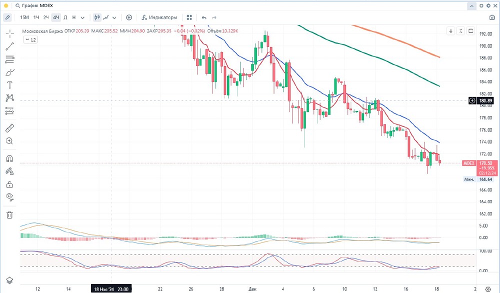 Добрый день уважаемые дамы и господа, инвесторы и трейдеры! 🚨Группа "Московская Биржа" включает в себя ПАО Московская биржа, которое управляет единственной в России многофункциональной биржевой площадкой по торговле акциями, облигациями, производными инструментами, валютой, инструментами денежного рынка и товарами. В состав Группы также входит центральный депозитарий (НКО АО "Национальный расчетный депозитарий"), а также клиринговый центр (НКО НКЦ (АО), выполняющий функции центрального контрагента на рынках, что позволяет Московской бирже оказывать клиентам полный цикл торговых и пост-трейдинговых услуг. ✅Позитив: 📍1. Мосбиржа разработала стандарты проведения IPO для российских компаний с целью повышения дисциплины эмитентов и доверия инвесторов к рынку. 📍2. Обсуждение создания деривативов на инструменты долгового рынка 📍3. Увеличение числа частных инвесторов на Мосбирже 📍4. Высокая КС выгодна для MOEX 📍5. Растущая популярность платформы "Финуслуги" ⛔Негатив: 📍1. Возросшие операционные расходы 📢Дополнительно: 🥇1. Чистая прибыль MOEX Group по МСФО за 9 месяцев 2024 года составила ₽61,88 млрд, увеличившись на 51,9% по сравнению с ₽40,724 млрд. 🥈2. Комиссионные доходы увеличились на 23,9% до ₽44,937 млрд против ₽36,258 млрд годом ранее. 🥉3. Операционные расходы за III кв выросли на 54% 💵Дивиденды: Дивидендная политика Московской биржи (утв. сентябрь 2023): целевой уровень доли прибыли, направляемой на выплату дивидендов, определяется как величина свободного денежного потока на собственный капитал. Минимальное значение уровня доли прибыли, направляемой на выплату дивидендов, составляет 50% от чистой прибыли по МСФО. 💴 - $MOEX : ФА Капитализация - 430.5 млрд ₽ Кол-во акций ао– 2276.0 млн Кол-во акций ап– 0.0 млн Р/Е = 7.08 P/S = 4.11 P/BV = 2.26 ROE = 27.3% EV/EBITDA = 3.55 Net debt/EBITDA = -1,69 DSI 0.36 ⏰ - ТФ 1 DAY 🛠 ТА - скользящие, стохастик, объем, МАСD, уровни. 📈- тренд вниз ‼- Гистограмма MACD в отрицательных значениях, линии MACD находятся в отрицательных значениях. Стохастик находится в зоне перепроданности. 13 авгучста цена пересекла сверху вниз 100 ЕМА и показывает нисходящую тенденцию. При закрытии дня выше 184,89 возможен разворот в лонг. На дневке решили нарисовать что-то похожее на отскок, уровни выше которых не плохо бы закрепиться это 176.01 и 178.3 ⏰ -ТФ 4 часа 🛠 ТА - скользящие, стохастик, объем, МАСD, уровни. 📈- тренд вниз ‼ - Гистограмма MACD в отрицательных значениях, линии MACD находятся в отрицательных значениях. Стохастик находится в зоне перепроданности. При закрытии выше 174,34 возможен разворот в лонг. 📊За 6 (06.24-11.24) месяцев цена снизилась более чем на 22 % . Мин. Рrice = 181.2 Мах. Рrice = 252.68 📌 Цены смены тренда указаны в соответствии с ТФ и являются ориентировочными и со временем смещаются.📌 🃏Всем профита и до скорой встречи!🃏