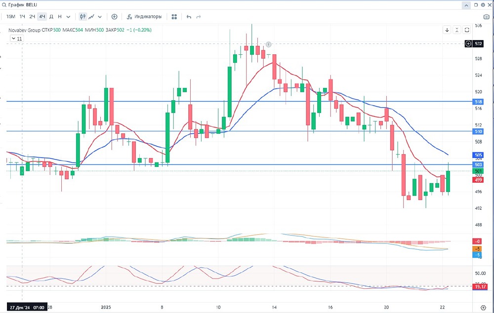 Добрый день уважаемые дамы и господа, инвесторы и трейдеры! 👉Пост написан по просьбе слушателей эфир👈 🚨Novabev Group (ранее BELUGA GROUP) — крупнейший российский вертикально-интегрированный производитель премиальных спиртных напитков, а также ведущий независимый импортер крепких спиртных напитков и вина с хорошо диверсифицированным премиальным портфелем импортных брендов. Основан в 1998 году. Выпускает водку под брендами Beluga, Veda, «Мягков», «Беленькая», «Государев заказ» и бренди «Золотой резерв». Занимается дистрибуцией премиального алкоголя компании William Grant & Sons и Camus. В холдинг также входит производитель продуктов питания «ПентаАгро». ✅Позитив: 📍1. Открытие новых магазинов ВинЛаб 📍2. Платит дивиденды 📍3. Высокая рентабельность капитала ⛔Негатив: 📍1. В октябре 2024 приостановили лицензию АО "Спиртзавод Чугуновский" 📍2. Планы правительства по сокращению потребления алкоголя 📍3. Возможное снижение рентабельности 📢Дополнительно: 🥇1. Чистая прибыль Novabev Group по РСБУ за 9 месяцев 2024 года составила ₽6 млрд, что на 48,3% ниже по сравнению с ₽11,6 млрд в предыдущем году. 🥈2. За 9 месяцев 2024 года отгрузки сократились на 2.8% 🥉3. Маркетплейсы Ozon, «Яндекс Маркет» и Wildberries начали продавать вино по модели Click&Collect через сеть магазинов «Винлаб». 💵Дивиденды: Размер дивидендных выплат НоваБев Групп (ранее Белуга Групп) установлен на уровне не менее 50% от прибыли по МСФО. Дивиденды планируют выплачивать 3 раза в год. 💴 - $BELU : ФА Капитализация - 84.8 млрд ₽ Кол-во акций ао– 15.8 млн Кол-во акций ап– 0.0 млн Р/Е - 10.5 P/S - 0.73 P/BV - 5.34 ROE - 30.6% EV/EBITDA - 5.13 DSI 0.5 ⏰ - ТФ 1 DAY 🛠 ТА - скользящие, стохастик, объем, МАСD, уровни. 📈- тренд вниз ‼- Гистограмма MACD в положительных значениях, линии MACD находятся в отрицательных значениях. Стохастик находится в районе средней линии, но снижается. При закрытии дня выше 518 возможен разворот в лонг. ⏰ -ТФ 4 часа 🛠 ТА - скользящие, стохастик, объем, МАСD, уровни. 📈- тренд вниз ‼ - Гистограмма MACD в отрицательных значениях, линии MACD находятся в отрицательных значениях. Стохастик выходит из зоны перепроданности. При закрытии выше 505 возможен разворот в лонг. Вполне вероятно, что цена продолжить идти выше, но явных факторов за быстрый рост не видно, не плохо бы для начала закрепиться выше 521-530. 📌 Цены смены тренда указаны в соответствии с ТФ и являются ориентировочными и со временем смещаются.📌 🃏Всем профита и до скорой встречи!🃏