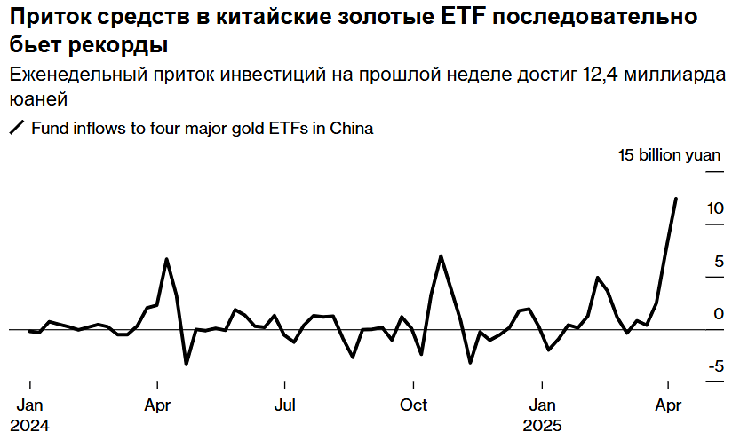 Золото в Китае обновляет рекорды на фоне торговой напряженности с США На прошлой неделе в Китае резко выросли объемы торговли золотом: металл обновлял рекорды на фоне нарастающей торговой напряженности с США. На Шанхайской фьючерсной бирже объемы торгов достигли годового максимума. Инвесторы и участники отрасли — от переработчиков до трейдеров — активизировали хеджирование из-за волатильности рынков и изменений в торговой политике. Повышенный внутренний спрос привел к премии в $20 за унцию относительно международных цен — разворот от дисконта, наблюдавшегося большую часть прошлого года. По прогнозу Goldman Sachs, цена золота может достичь $4000 за унцию в 2026 году — рост на 25% от текущих уровней — на фоне покупок центробанками и угрозы рецессии. Народный банк Китая пополнил резервы на 2,8 тонны в марте, пятый месяц подряд. В аналогичной ситуации в 2019 году Пекин закупил более 100 тонн. Сильный приток зафиксирован в золотые ETF: на прошлой неделе — 12,4 млрд юаней ($1,7 млрд), почти вдвое выше показателя предыдущей недели. По словам аналитиков, текущий спрос менее спекулятивен, он стратегический и устойчивый. Банки продвигают продукты для регулярного накопления золота. Акции и облигации остаются под давлением, инвесторы предпочитают защитные активы. На фоне снижения доверия к доллару и казначейским бумагам усиливаются призывы к диверсификации резервов. По мнению аналитиков, Китай продолжит наращивать долю золота в резервах. С начала года золото подорожало более чем на 20%. Goldman Sachs ожидает цену $3700 за унцию к концу 2025 года и $4000 — к середине 2026-го. Источник: www.bloomberg.com