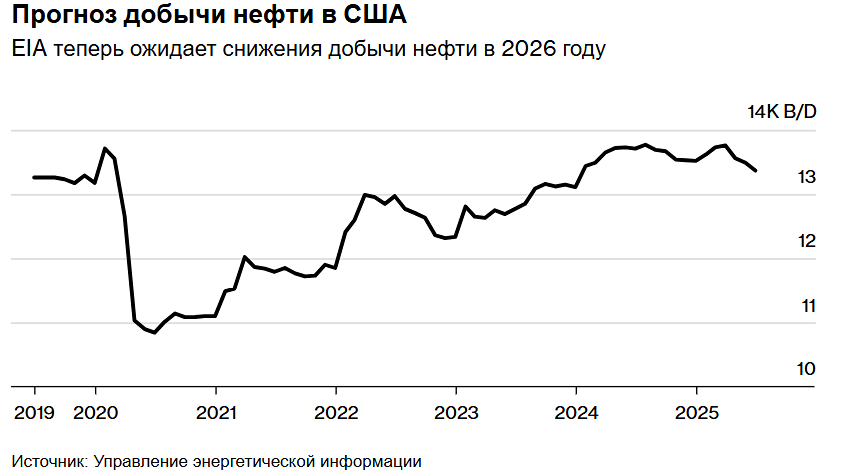 США снизят добычу нефти в 2026 году впервые с 2021 года В 2026 году в США ожидается первое с 2021 года снижение добычи нефти — до 13,37 млн баррелей в сутки против 13,42 млн б/с в 2025 году, согласно обновлённому прогнозу Управления энергетической информации (EIA). Это на 120 тыс. б/с ниже майской оценки и отражает падение буровой активности на фоне снижения цен и ослабления спроса. Основное сокращение ожидается в сланцевом секторе: добыча сланцевой нефти, по оценкам EIA, снизится до 11,09 млн б/с вместо ранее прогнозировавшихся 11,25 млн. Темпы добычи в Пермском бассейне замедляются, а количество буровых установок в США достигло минимума с 2020 года. Некоторые компании, включая Diamondback Energy, заявляют о прохождении пика. Четвёртый месяц подряд растёт число пробуренных, но не завершённых скважин (DUC) — в мае на 25, до 5319. Это сигнал выжидательной стратегии: операторы накапливают DUC, рассчитывая на последующее завершение при росте цен. Рост добычи на шельфе (до 1,85 млн б/с в 2026 году, +40 тыс. б/с к прошлому прогнозу) частично компенсирует спад в сланцевых регионах. EIA также снизило прогноз роста глобального спроса на нефть — до +800 тыс. б/с в 2025 году (до 103,5 млн б/с), вместо ожидавшегося ранее прироста на 1 млн. При этом ожидается рост мировых запасов более чем на 800 тыс. б/с — максимальный с начала публикации данных на 2025 год. Падение добычи ставит под угрозу планы президента Трампа по энергетическому доминированию США, несмотря на объявленное чрезвычайное положение и призывы к наращиванию бурения. Источник: www.bloomberg.com