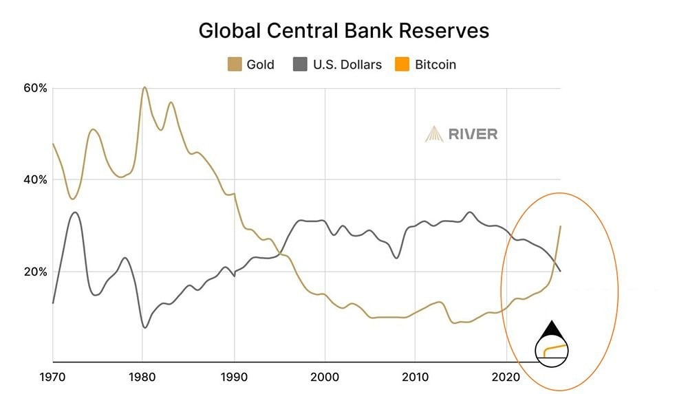 Золото стало для мировых ЦБ крупнейшим резервным активом. Долларовые активы наоборот - активно продаются, а BTC только начинает появляться в резервах мировых ЦБ — данные River