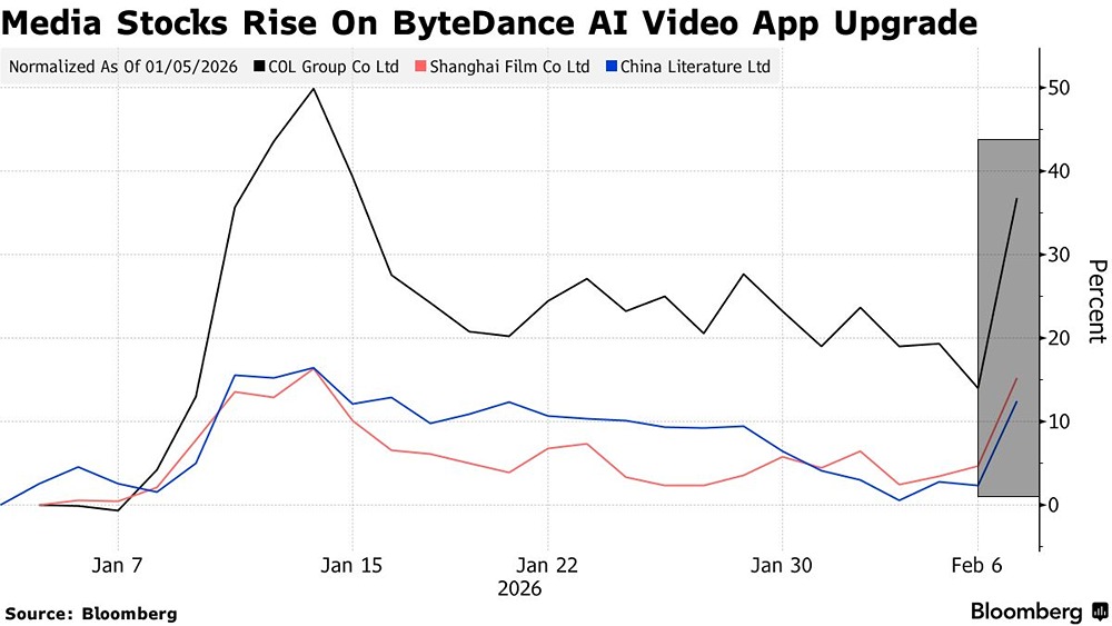 Новейшая модель генерации видео от ByteDance Ltd. вызвала рост акций китайских медиакомпаний и компаний, занимающихся разработкой приложений на основе искусственного интеллекта, после того, как произвела впечатление на аналитиков качеством создаваемого контента. Издательская компания COL Group Co. достигла 20-процентного верхнего предела дневной торговой сессии, в то время как акции Shanghai Film Co. и игровой и развлекательной компании Perfect World Co. выросли на 10% каждая. Индекс CSI 300, индекс которого охватывает внутренний рынок, вырос на 1,4%. Рост цен на акции произошел после того, как компания ByteDance, владеющая популярным видеохостингом TikTok, 7 февраля запустила свою новейшую версию приложения для создания видео с помощью ИИ — Seedance 2.0, которое удивило наблюдателей качеством созданных роликов. Это последний пример энтузиазма инвесторов по поводу собственных технологий ИИ, которые подпитывали рост второго по величине фондового рынка мира в прошлом году. [mondiara.com](https://mondiara.com) 👆 Больше новостей и анализа Скачать приложение в [App Store](https://apps.apple.com/ru/app/m-o-n-d-i-a-r-a/id6475953453) Скачать приложение в [Google Play](https://play.google.com/store/apps/details?id=com.mondiara.app)