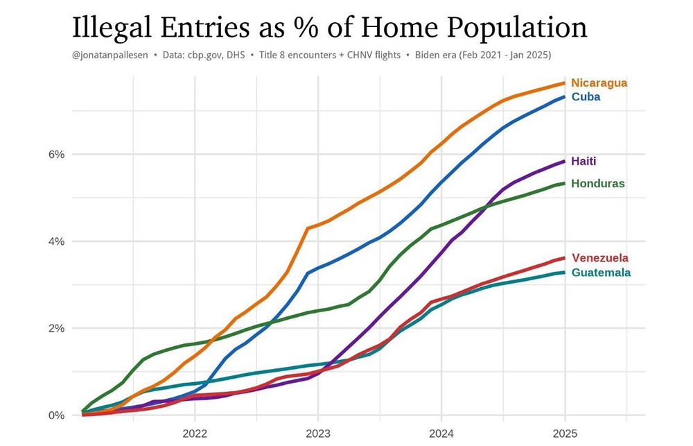 Всего за четыре года правления Байдена в США переехало: 8% жителей Никарагуа, 7% Кубы, 6% Гаити и 5% Гондураса