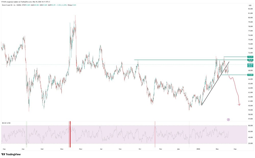 Котировки 2 раза пытались пробиться выше 70, но не получилось, и цена перешла в накопление. Если цена уйдет ниже уровня 67, есть высокая вероятность, что падение продолжится, а для продолжения роста цене нужно пробить 71,11. Не является индивидуальной инвестиционной рекомендацией [mondiara.com](https://mondiara.com) 👆 Больше новостей и анализа [Скачать](https://apps.apple.com/ru/app/m-o-n-d-i-a-r-a/id6475953453) приложение в App Store [Скачать](https://play.google.com/store/apps/details?id=com.mondiara.app) приложение в Google Play Пост взят с международного сервиса для инвесторов и трейдеров [M O N D I A R A](https://i.mondiara.com/) Источник: Восходящий тренд