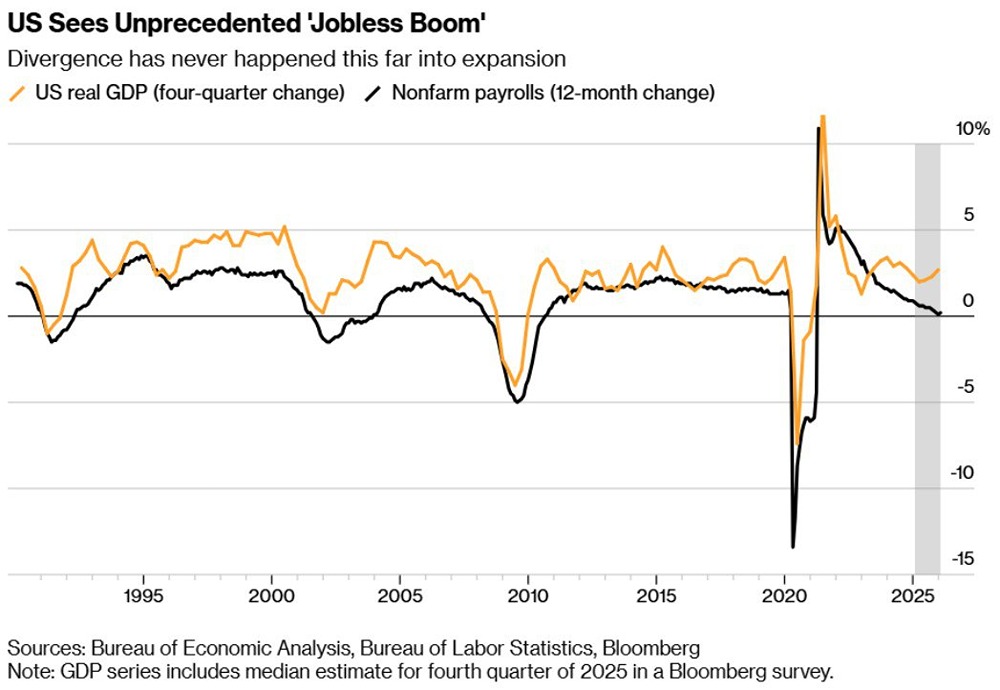 Американские экономисты в замешательстве. Прежний постулат, что экономический рост увеличивает занятость – пал. Аналитики ожидают, что опубликованный в пятницу отчёт о ВВП покажет рост экономики на 2,7% в 2025 году, что является солидным темпом по любым меркам для развитой страны. Однако занятость практически не выросла, и это сочетание вызывает сравнения с печально известным «восстановлением без создания рабочих мест» начала 2000-х годов, последовавшим за крахом и последующим обвалом технологического пузыря. Однако есть одно существенное различие между тем временем и сегодняшним днем, которое делает нынешнее расхождение ещё более необычным: эпизод 2000-х годов начался с рецессии. На этот раз «бум без создания рабочих мест» происходит без рецессии. Это первый подобный случай в послевоенную эпоху. Вероятно, нам всем придётся свыкаться с новым постулатом: ИИ-зация, автоматизация и роботизация, приводящие к высоким темпам роста, больше не создают новых рабочих мест. Скорее, - даже сокращают рабочие места. Правительства многих стран теперь будут стоять перед дилеммой: нам нужен экономический рост или социальная стабильность, в т.ч. связанная с созданием новых рабочих мест и низким уровнем безработицы. Компромиссом может стать создание правительством всё больше рабочих мест в госсекторе, чтобы чем-то занимать оказавшуюся лишней рабсилу – вплоть до увеличения «бредовых, бессмысленных рабочих мест в бюджетном секторе», по экономисту и социальному антропологу Дэвиду Греберу. Пост взят с международного сервиса для инвесторов и трейдеров [M O N D I A R A](https://i.mondiara.com/) Источник: Proeconomics
