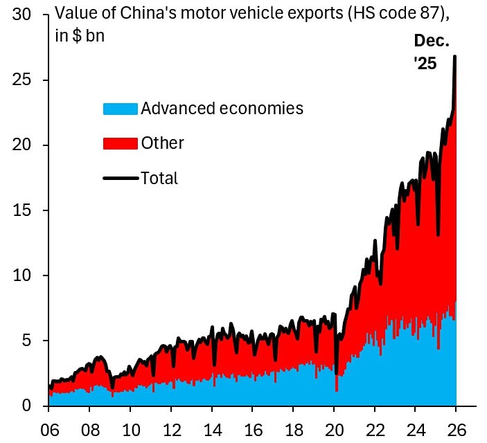 Экспорт китайских автомобилей резко вырос в декабре 2025 года. Все эти автомобили поставляются на развивающиеся рынки (красное), а не в страны G10 (синее). Это осложняет усилия ЕС по защите своих автопроизводителей. Резкий рост китайского экспорта уничтожает экспортные рынки ЕС. С этим мало что могут поделать тарифы ЕС. Пост взят с международного сервиса для инвесторов и трейдеров [M O N D I A R A](https://i.mondiara.com/)